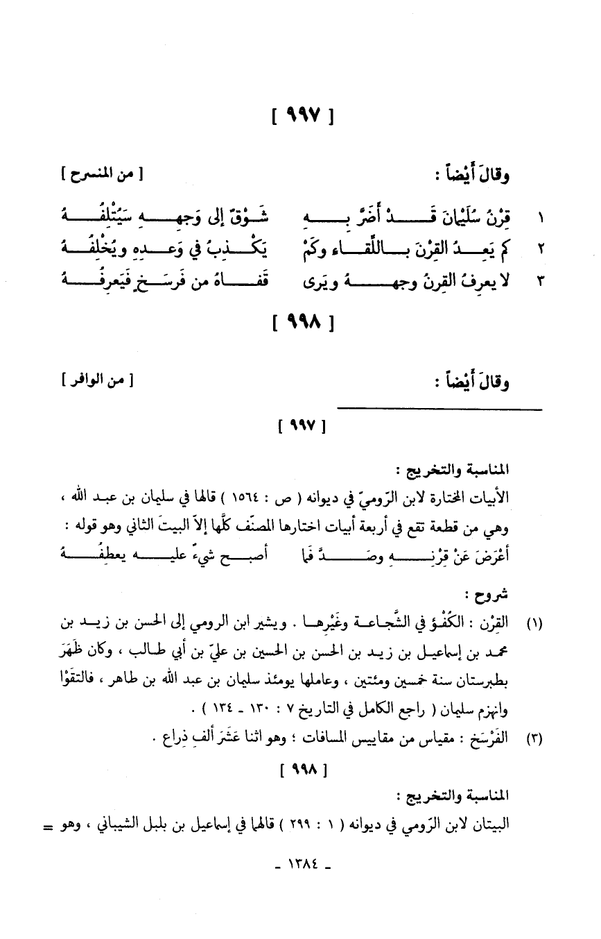 (قِرْنُ سُلَيْمانَ قَدْ أَضَرَّ بِهِ ... شَوْقٌ إِلَى وَجهِهِ سُيُتْلفُهُ)