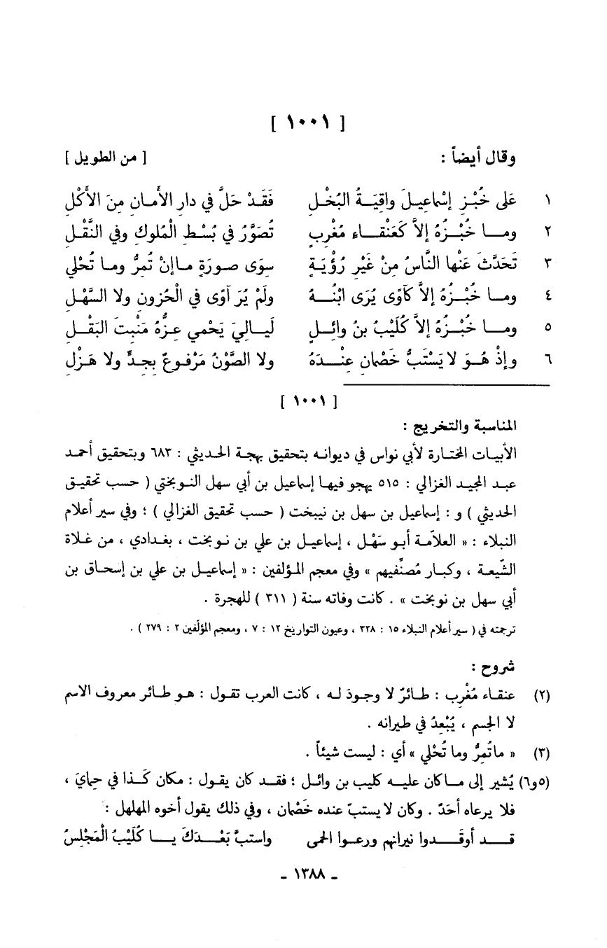 (وَمَا خُبْزُهُ إلاَّ كعَنْقاءٍ مُغْربٍ ... تُصَوَّرُ فِي بُسْطِ الْمُلوكِ وَفِي النَّقلِ)