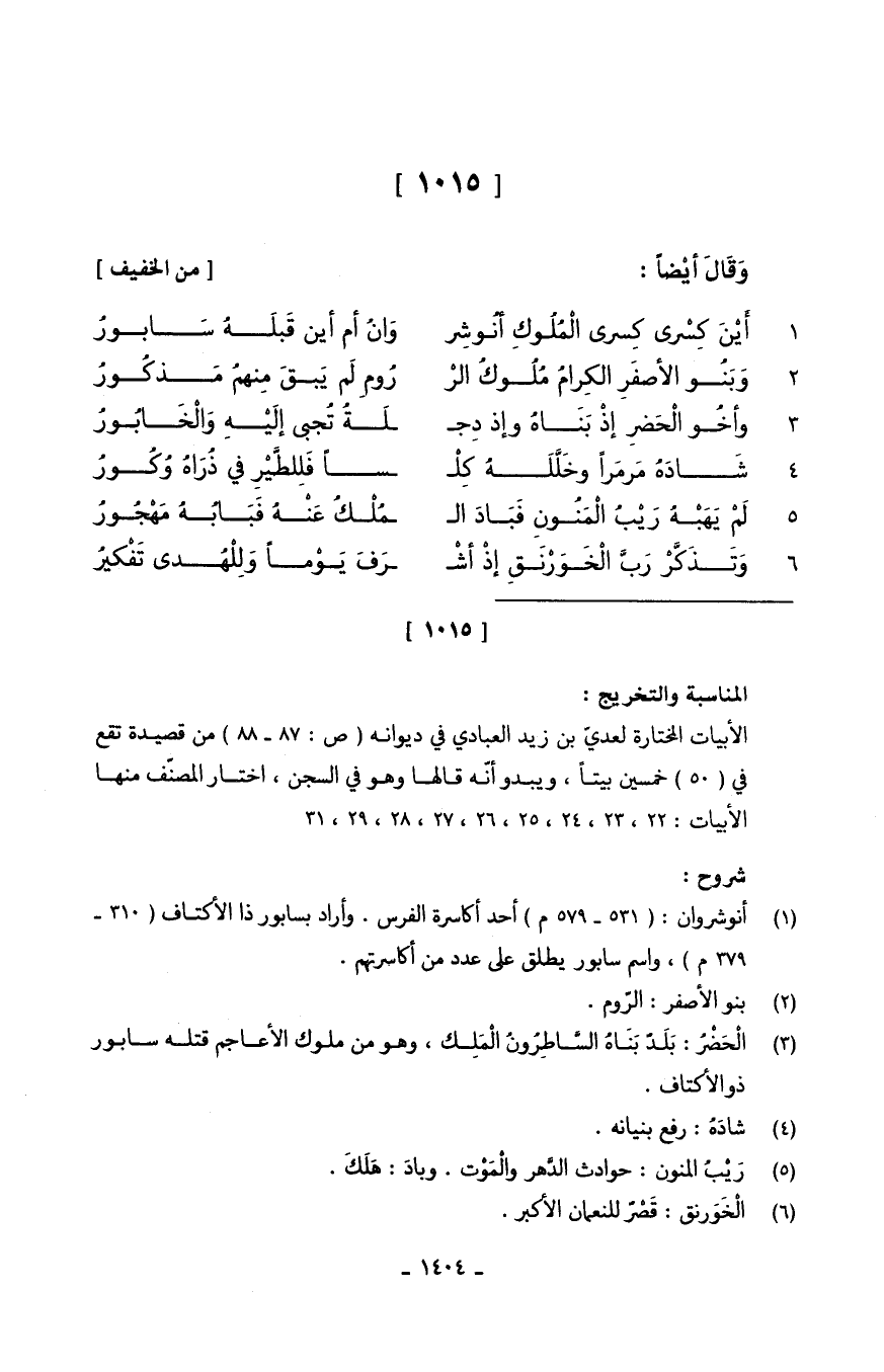 (أَيْنَ كِسْرى كِسرى الْمُلُوكِ أنُوشِر ... وَانُ أم أَيْن قَبلَهُ سَابورُ)