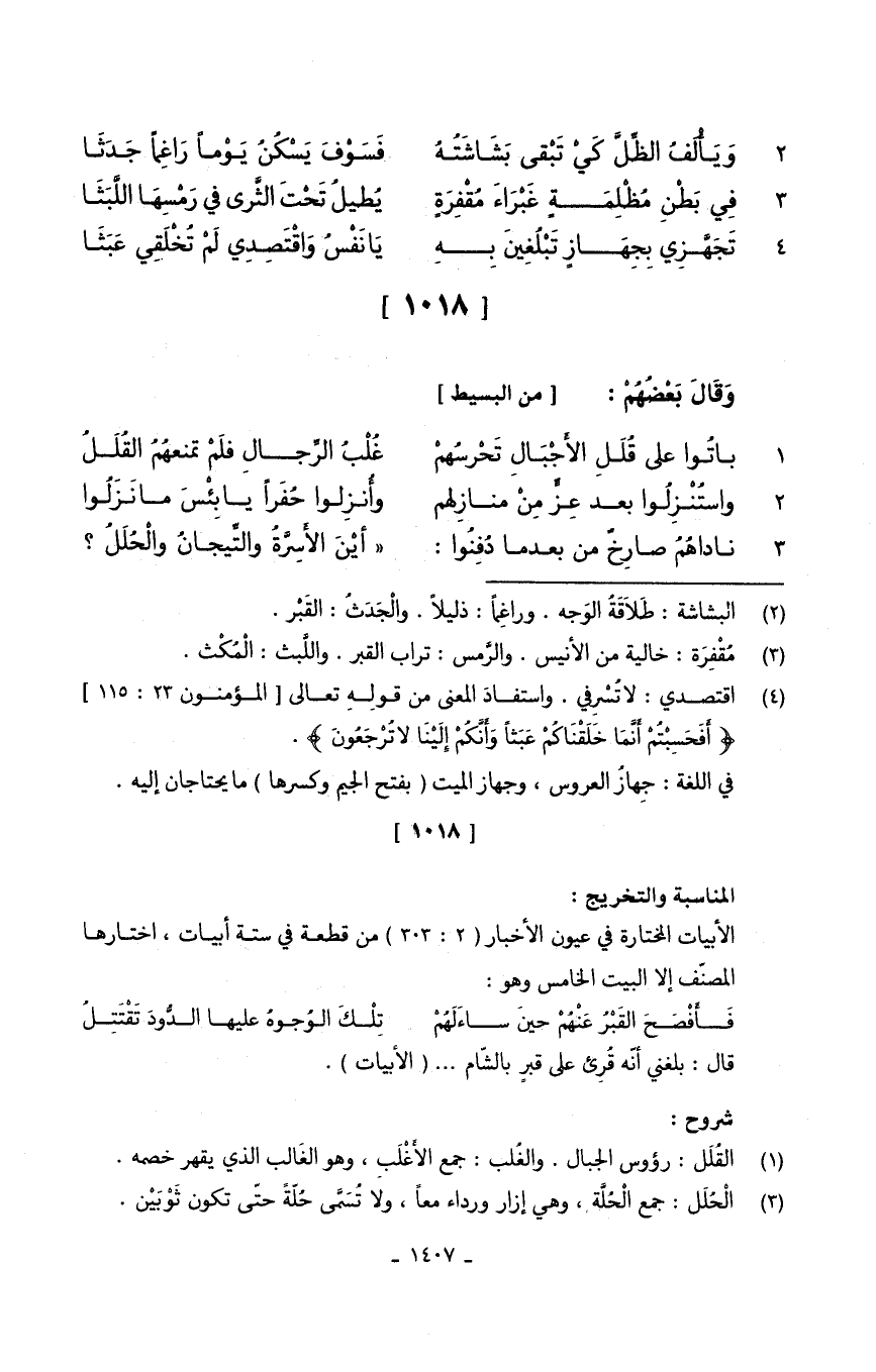 (ناداهُمُ صارِخٌ من بَعْدَمَا دُفُنِوا ... أيْنَ الأَسِرَّةُ والتَّيجانُ والْحُلَلُ)