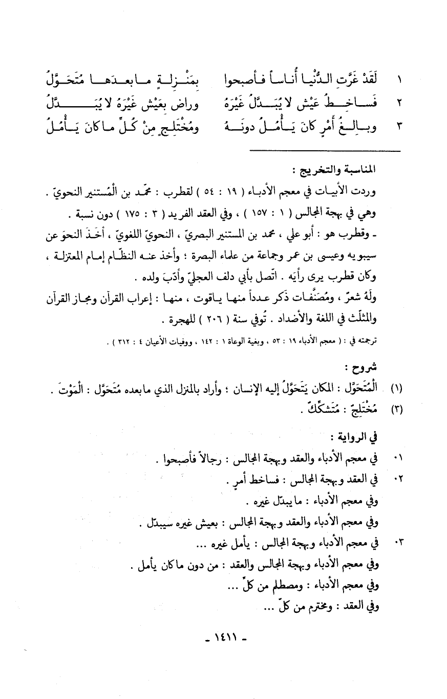 1 -. لَقَدْ غَرَّتِ الدُّنْيا أُناساً فَأَصْبحُوا ... بِمَنْزلةِ مَا بعدَها مُتَحَوَّلُ)