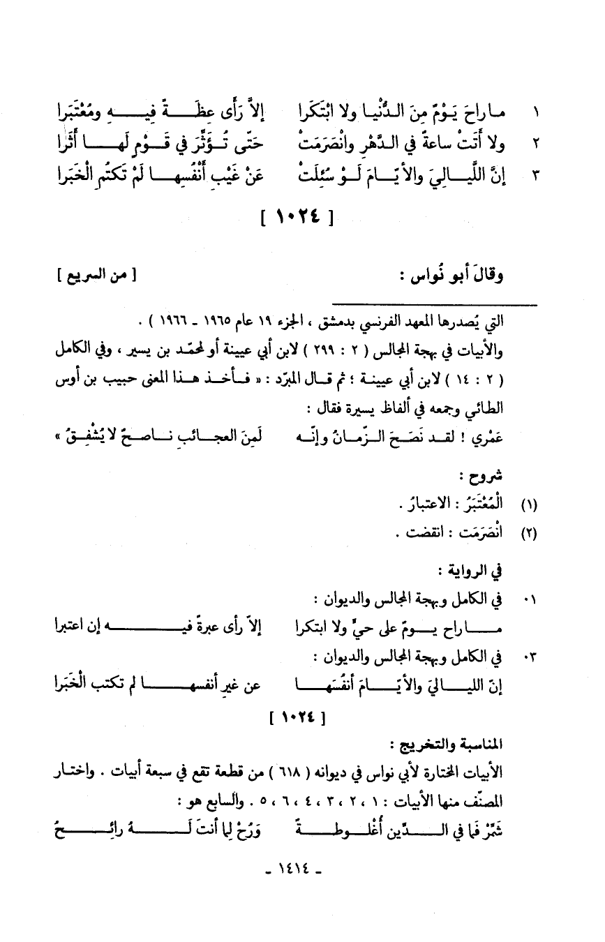 (مَا راحَ يَوْمٌ مِنَ الدُّنْيا وَلَا ابْتَكَرا ... إلاَّ رَأَى عِظَةُ فِيهِ ومُعْتَبرا)