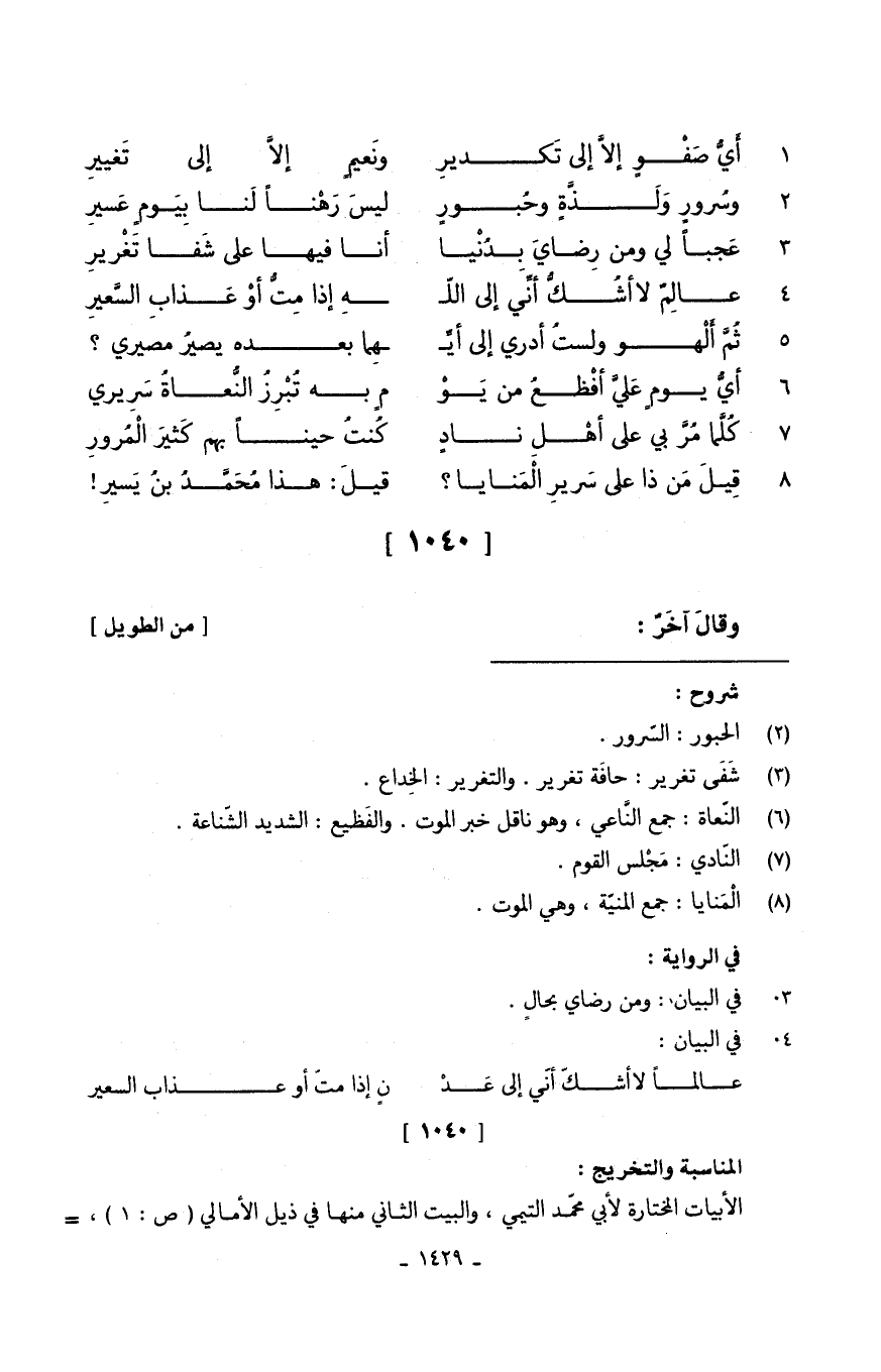 (أَيُّ صَفْوِ إلاَّ إِلَى تَكديرِ ... ونَعيمٍ إلاَّ إِلَى تَغيير)
