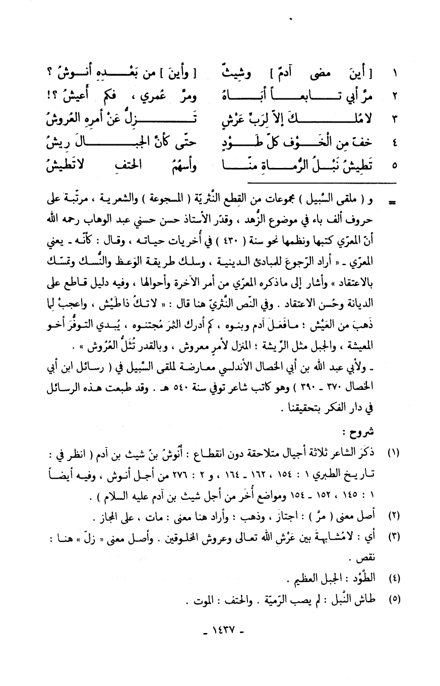 (أينَ مضى آدمٌ وشِيثٌ وأينَ من بَعْدِهِ أنوشُ)