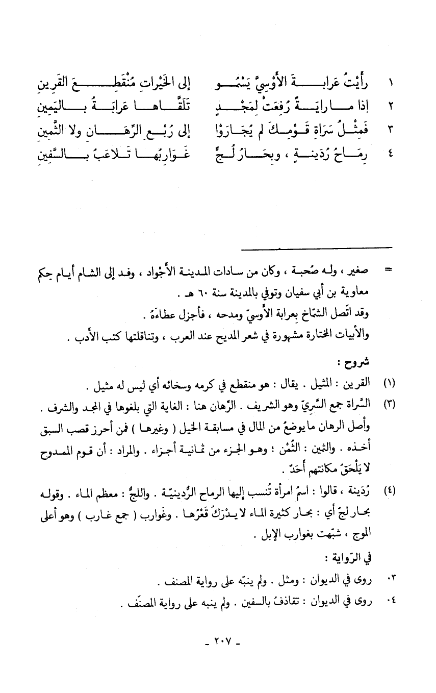 (رَأَيْت عرابة الأوسي يسمو ... إِلَى الْخيرَات مُنْقَطع القرين)