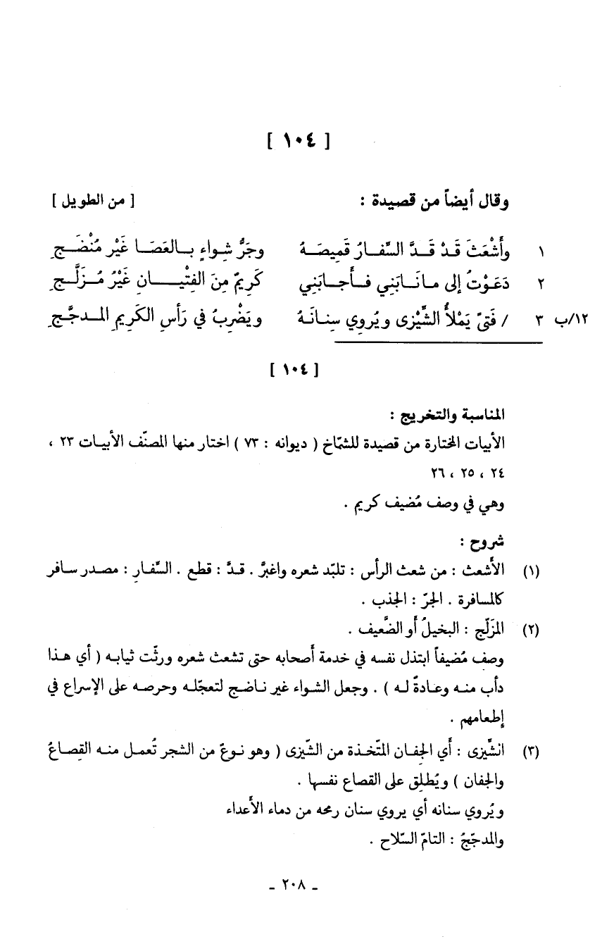 (فَتى يمْلَأ الشيزى ويروي سنانه ... وَيضْرب فِي رَأس الْكَرِيم المدجج)