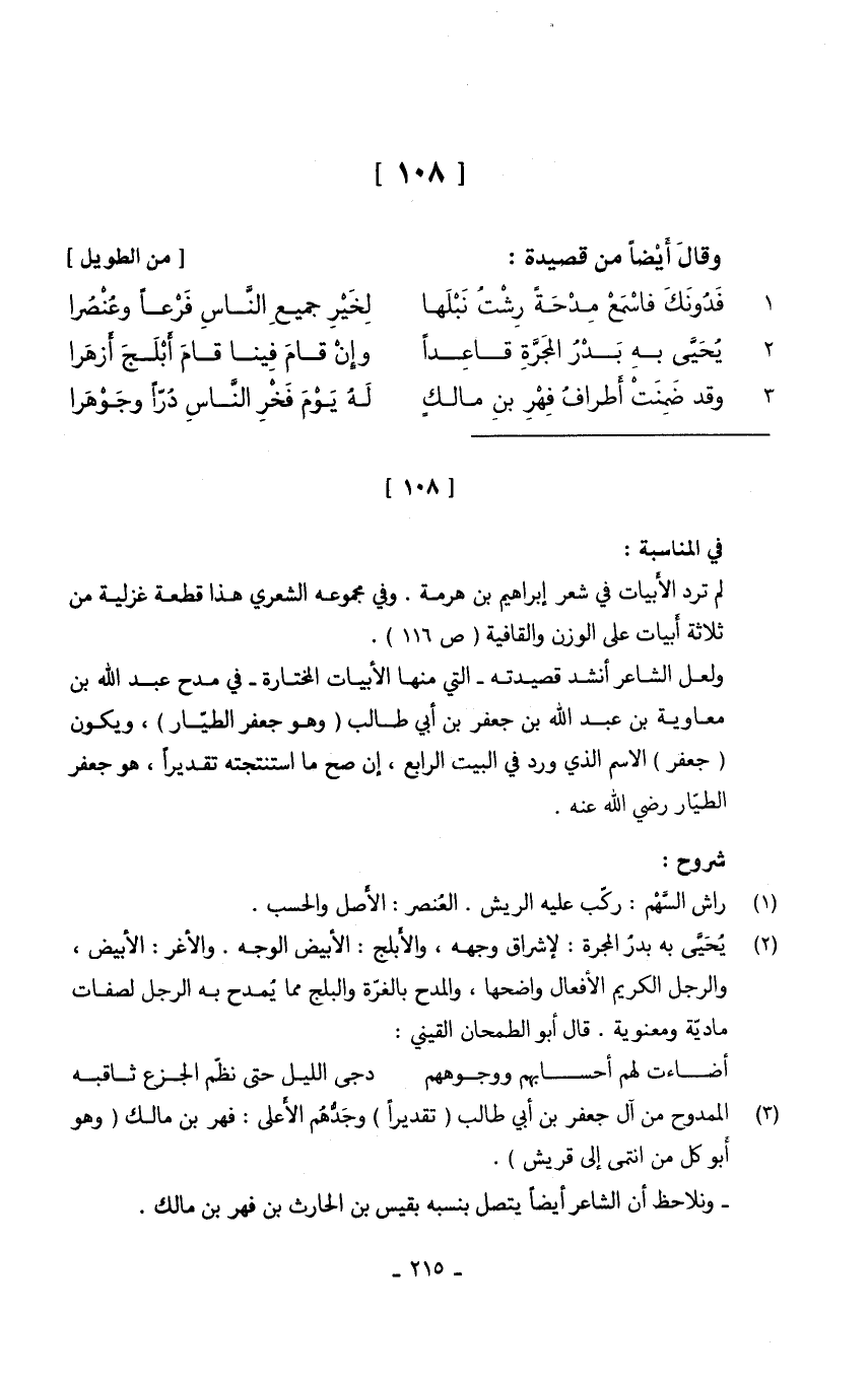 (وَقد ضمنت أَطْرَاف فهر بن مالكٍ ... لَهُ يَوْم فَخر النَّاس درا وجوهرا)