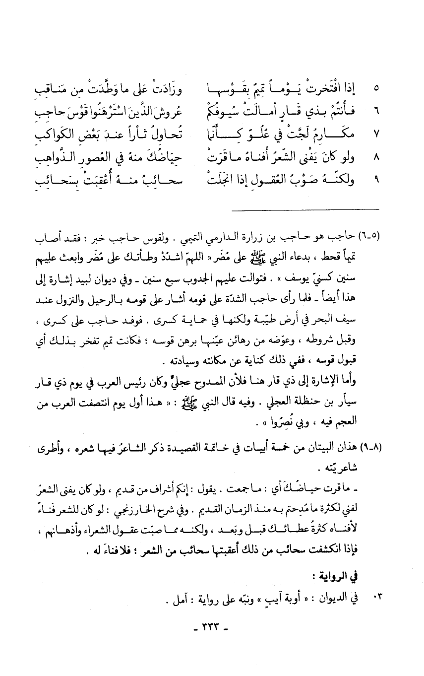 (فَأنْتم بِذِي قارٍ أمالت سُيُوفكُمْ ... عروش الَّذين استرهنوا قَوس حَاجِب)