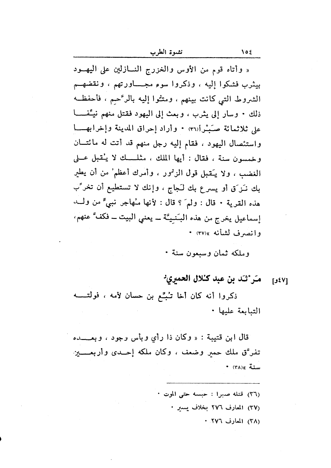 "وأتاه قوم من الأوس والخزرج النازلين على اليهود بيثرب فشكوا إليه، وذكروا سوء مجاورتهم، ونقضهم الشروط التي كانت بينهم، ومتوا إليه بالرحم، فأحفظه ذلك. وسار إلى يثرب، وبعث إلى اليهود فقتل منهم نيفا على ثلاثمائة صبراً. وأراد إحراق المدينة وإخراجها واستئصال اليهود، فقال إليه رجل منهم قد أتت له مائتان وخمسون سنة، فقال: أيها الملك، مثلك لا يقبل على الغضب، ولا يقبل قول الزور، وأمرك أعظم من أن يطير بك نزق أو يسرع بك لجاج، وإنك لا تستطيع أن تخرب هذه القرية. قال: ولم؟ قال: لأنها مهاجر نبي من ولد إسماعيل يخرج من هذه البنية - يعني البيت - فكف عنهم، وانصرف لشأنه".