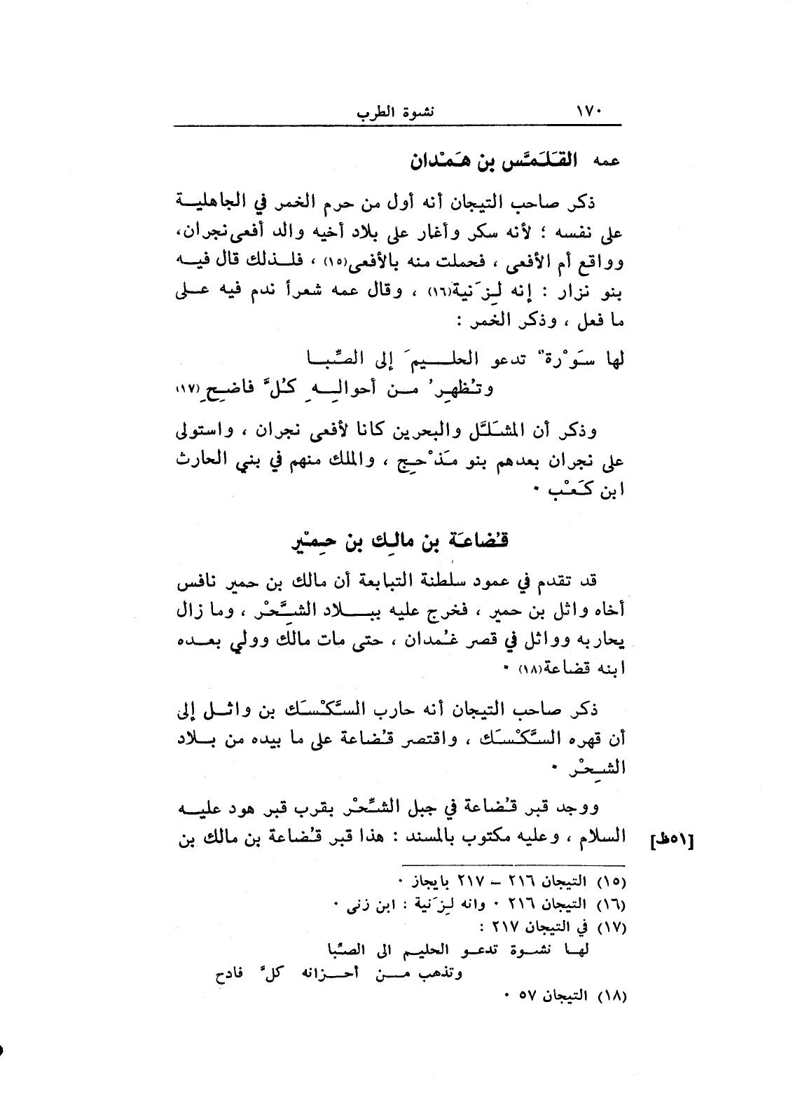 وذكر أن المشلل والبحرين كانا لأفعى نجران، واستولى على نجران بعدهم بنو مذحج، والملك منهم في بني الحارث ابن كعب.