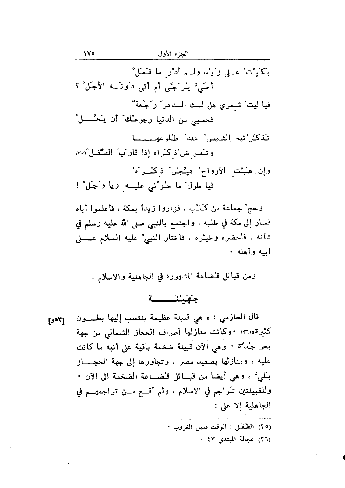 قال الحازمي: "هي قبيلة عظيمة ينتسب إليها بطون كثيرة". وكانت منازلها أطراف الحجاز الشمالي من جهة بحر جدة. وهي الآن قبيلة ضخمة باقية على أنبه ما كانت عليه، ومنازلها بصعيد مصر، وتجاورها إلى جهة الحجاز بلي، وهي أيضاً من قبائل قضاعة الضخمة إلى الآن. وللقبيلتين تراجم في الإسلام، ولم أقع من تراجمهم في الجاهلية إلا على: