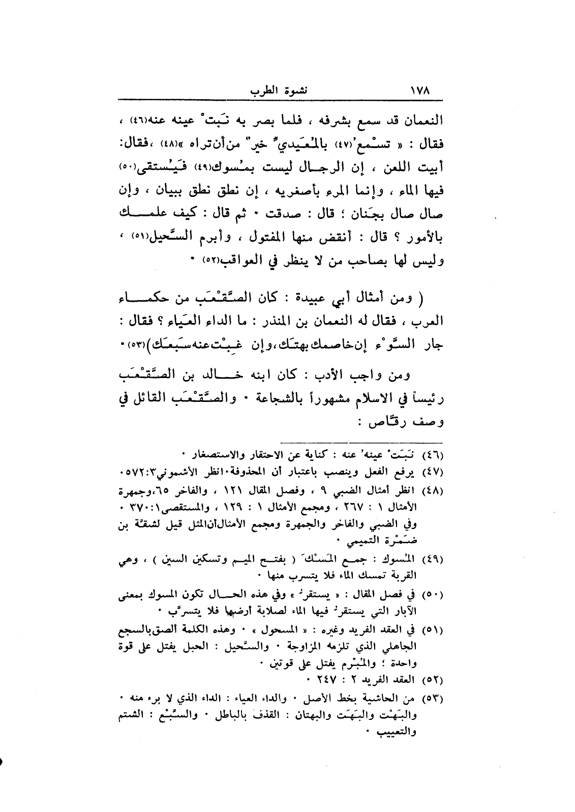 النعمان قد سمع بشرفه، فلما بصر به نبت عينه عنه، فقال: "تسمع بالمعيدي خير من أن تراه"، فقال: أبيت اللعن، إن الرجال ليست بمسوك فيستقى فيها الماء، وإنما المرء بأصغريه، إن نطق نطق ببيان، وإن صال صال بجنان؛ قال: صدقت. ثم قال: كيف علمك بالأمور؟ قال: أنقض منها المفتول، وأبرم السحيل، وليس لها بصاحب من لا ينظر في العواقب.