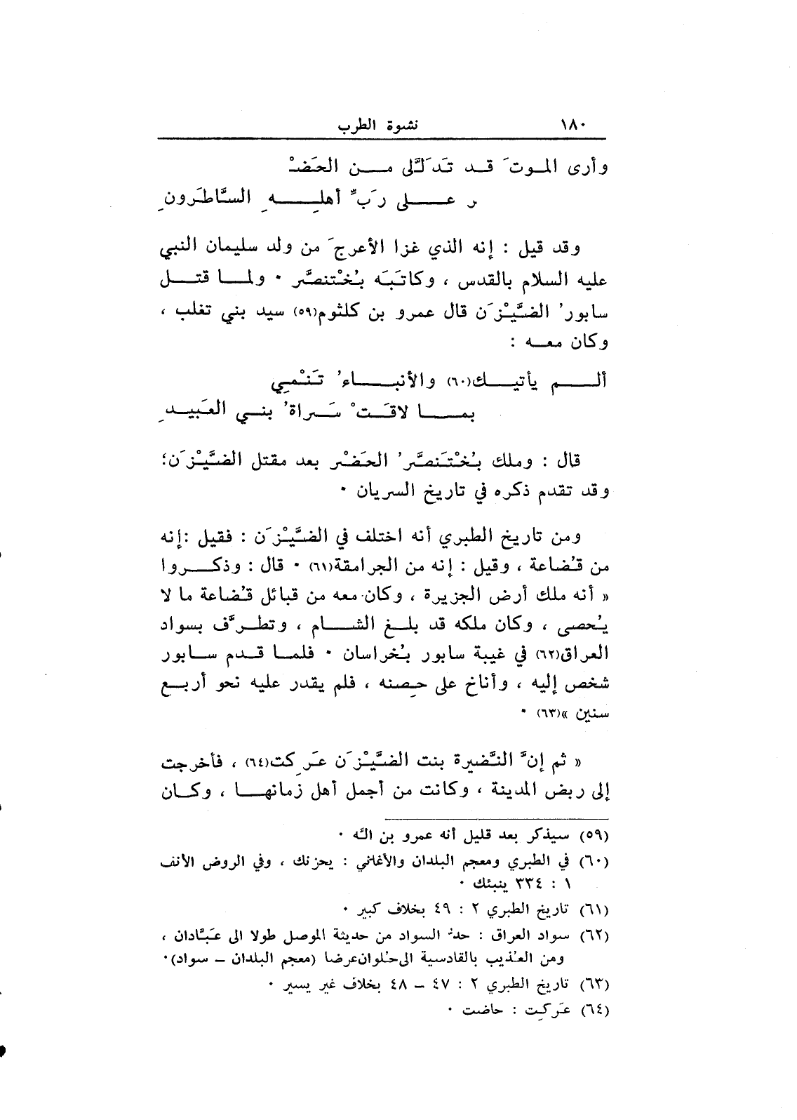 "ثم إن النضيرة بنت الضيزن عركت، فأخرجت إلى ربض المدينة، وكانت من أجمل أهل زمانها، وكان