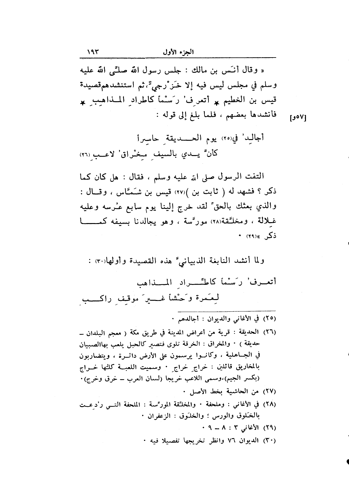 "وقال أنس بن مالك: جلس رسول الله صلى الله عليه وسلم في مجلس ليس فيه إلا خزرجي، ثم استنشدهم قصيدة قيس بن الخطيم أتعرف رسماً كاطراد المذاهب فأنشدها بعضهم، فلما بلغ إلى قوله: