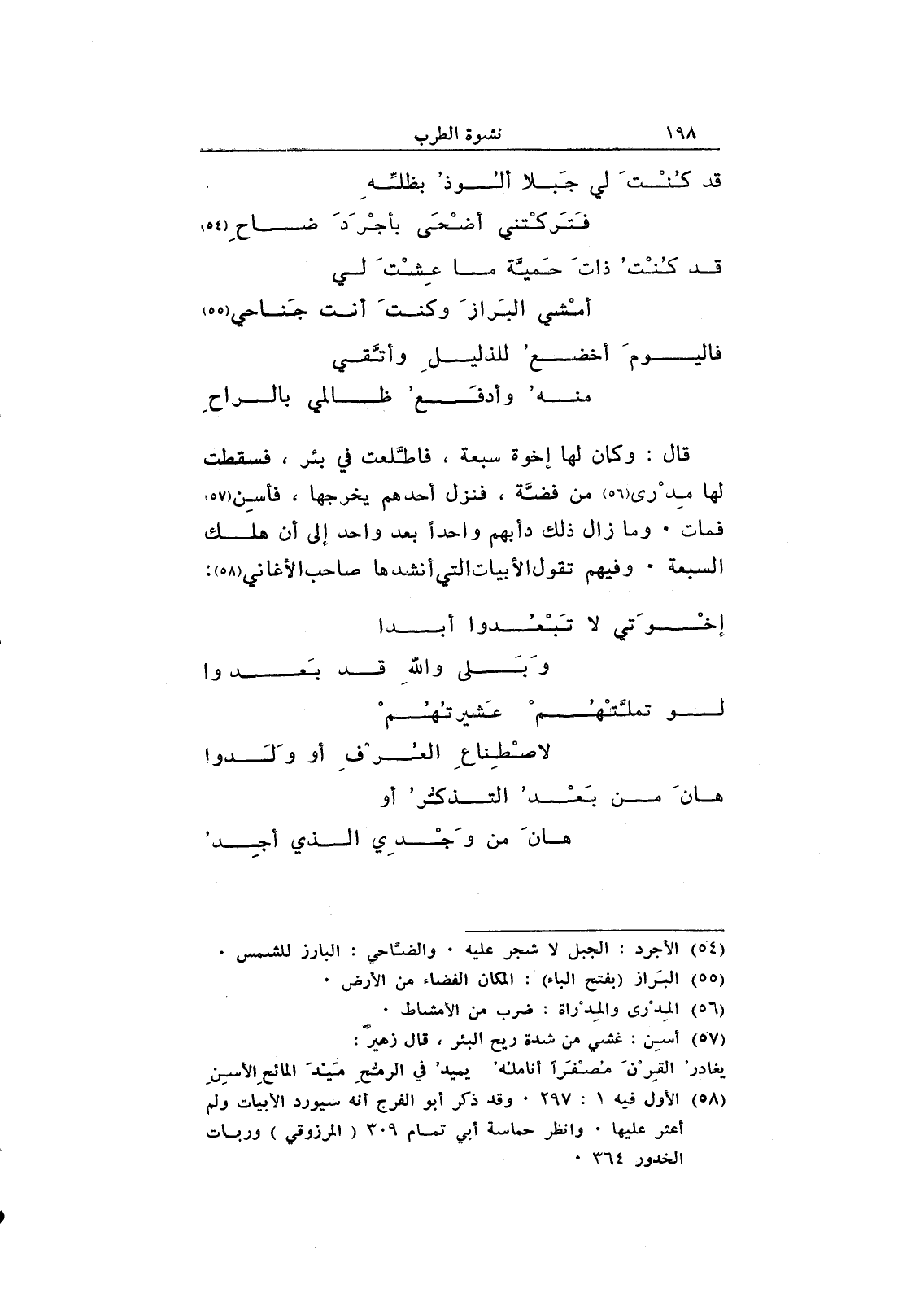 قال: وكان لها إخوة سبعة، فاطلعت في بئر، فسقطت لها مدرى من فضة، فنزل أحدهم يخرجها، فأسن فمات. ومازال ذلك دأبهم واحداً بعد واحد إلى أن هلك السبعة. وفيهم تقول الأبيات التي أنشدها صاحب الأغاني: