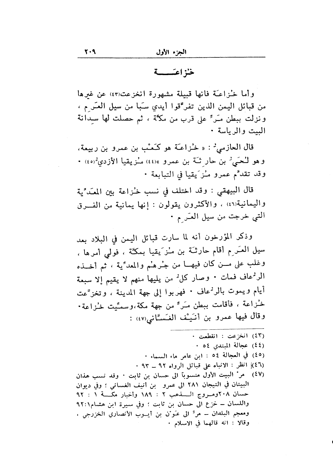وأما خزاعة فإنها قبيلة مشهورة انخزعت عن غيرها من قبائل اليمن الذين تفرقوا أيدي سبا من سيل العرم، ونزلت ببطن مر على قرب من مكة، ثم حصلت لها سدنة البيت والرياسة.