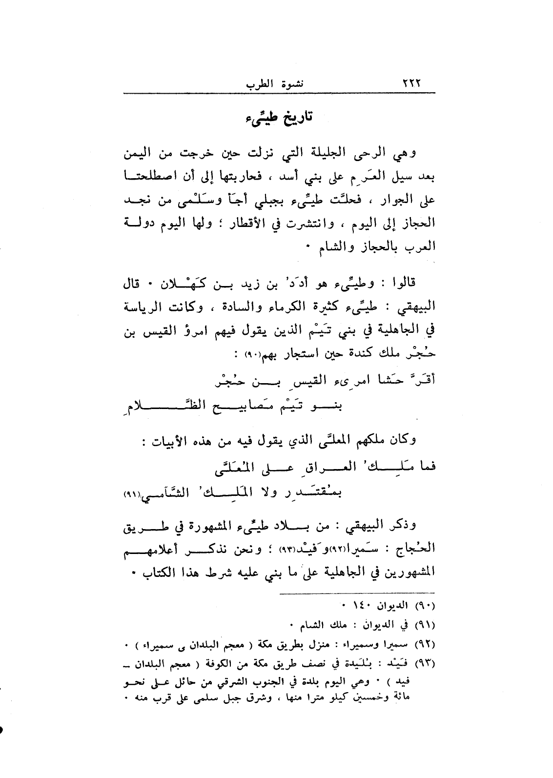 وذكر البيهقي: من بلاد طيء المشهورة في طريق الحجاج: سميرا وفيد؛ ونحن نذكر أعلامهم المشهورين في الجاهلية على ما بني عليه شرط هذا الكتاب.