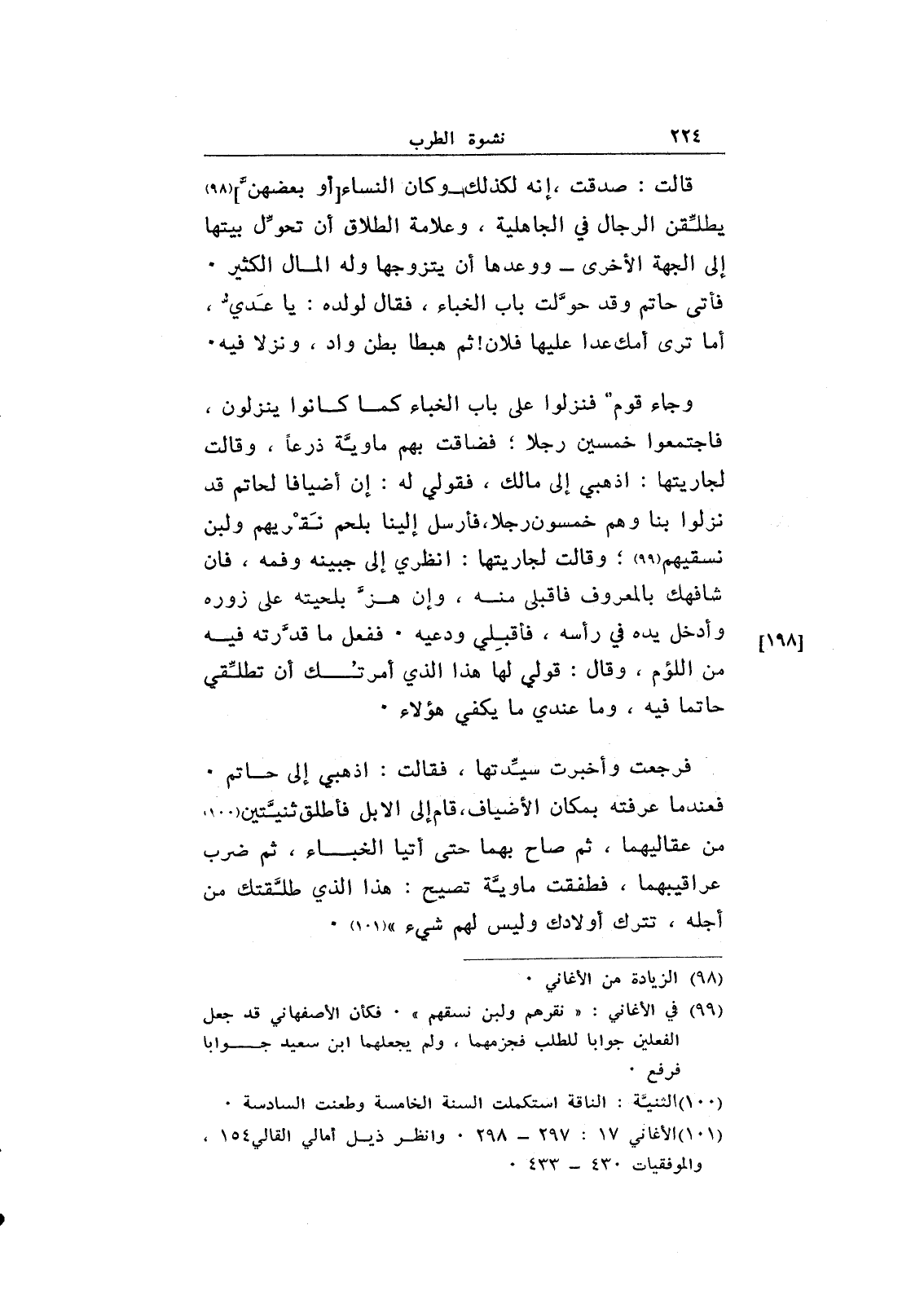 فرجعت وأخبرت سيدتها، فقالت: اذهبي إلى حاتم. فعندما عرفته بمكان الأضياف، قام إلى الإبل فأطلق ثنيتين من عقاليهما، ثم صاح بهما حتى أتيا الخباء، ثم ضرب عراقيبهما، فطفقت ماوية تصيح: هذا الذي طلقتك من أجله، تترك أولادك وليس لهم شيء".