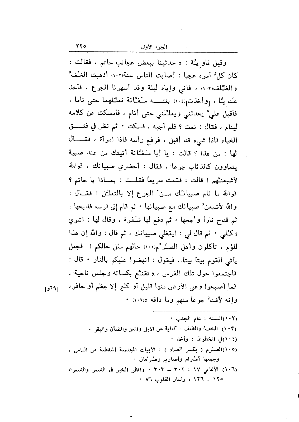 وقيل لماوية: "حدثينا ببعض عجائب حاتم، فقالت: كان كل أمره عجباً: أصابت الناس سنة أذهبت الخف والظلف، فإني وإياه ليلة وقد أسهرنا الجوع، فأخذ عدياً، و [أخذت] بنته سفانة نعللهما حتى ناما، فأقبل علي يحدثني ويعللني حتى أنام، فأمسكت عن كلامه لينام، فقال: نمت؟ فلم أجبه، فسكت. ثم نظر في فتق الخباء فإذا شيء من أقبل، فرفع رأسه فإذا امرأة، فقال لها: من هذا؟ قالت: يا أبا سفانة أتيتك من عند صبية يتعاوون كالذئاب جوعا، فقال: أحضري صبيانك، فوالله لأشبعنهم! قالت: فقمت سريعاً فقلت: بماذا يا حاتم؟ فوالله ما نام صبيانك من الجوع إلا بالتعلل! فقال: والله لأشبعن صبيانك مع صبيانها. ثم قام إلى فرسه فذبحها، ثم قدح ناراً وأججها ثم دفع لها شفرة، وقال لها: اشوي وكلي. ثم قال لي: أيقظي صبيانك، ثم قال: والله إن هذا للؤم، تأكلون وأهل الصرم حالهم مثل حالكم! فجعل يأتي القوم بيتاً بيتاً، فيقول: انهضوا عليكم بالنار. قال: فاجتمعوا حول تلك الفرس، وتقنع بكسائه وجلس ناحية، فما أصبحوا وعلى الأرض منها قليل أو كثير إلا عظم أو حافر، وإنه لأشد جوعاً منهم وما ذاقه".