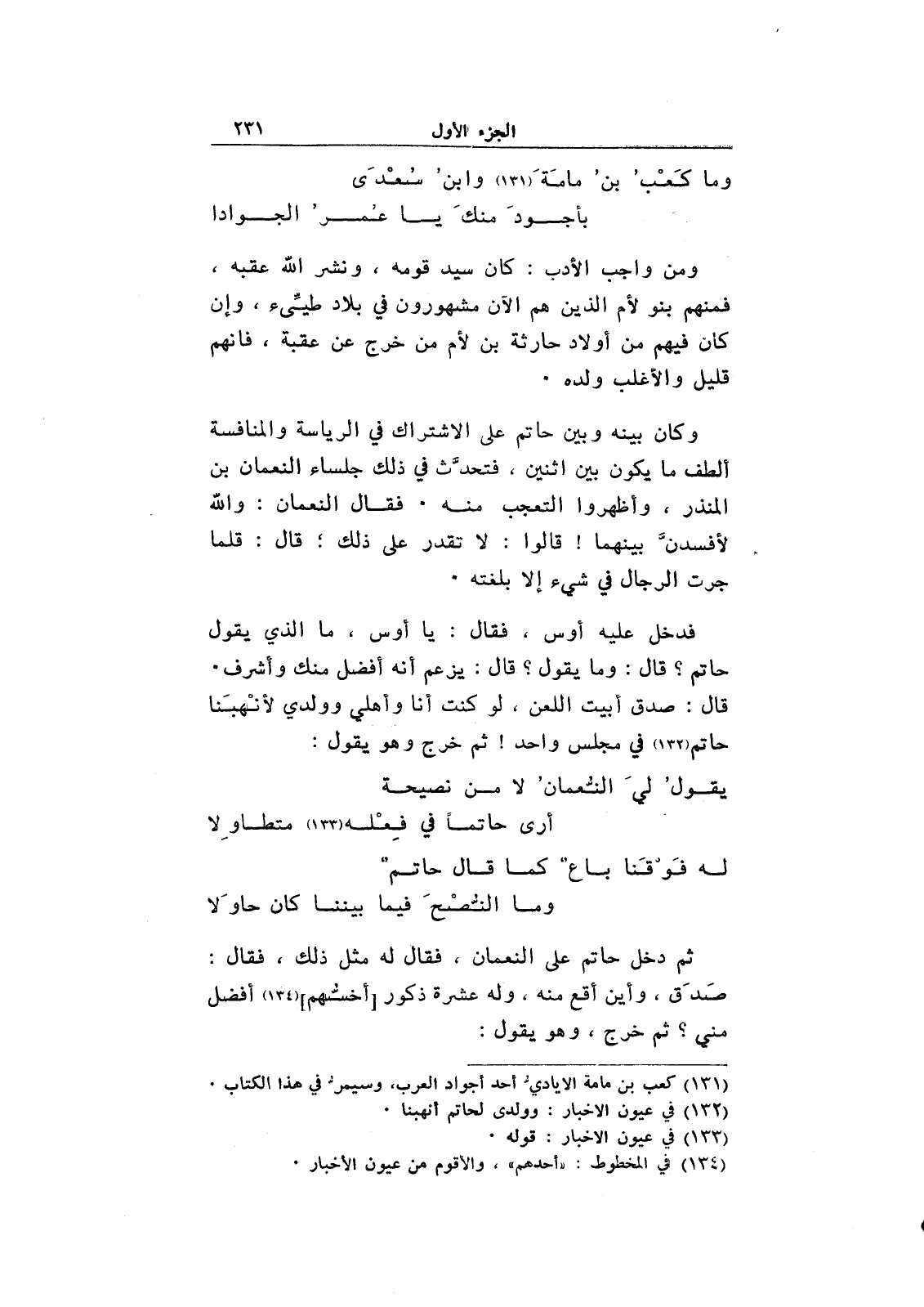 ثم دخل حاتم على النعمان، فقال له مثل ذلك، فقال: صدق، وأين أقع منه، وله عشرة ذكور [أخسهم] أفضل مني؟ ثم خرج، وهو يقول