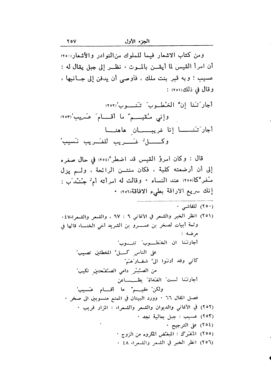 ومن كتاب الأشعار فيما للملوك من النوادر والأشعار أن امرأ القيس لما أيقن بالموت، نظر إلى جبل يقال له: عسيب؛ وبه قبر بنت ملك، فأوصى أن يدفن إلى جانبها، وقال في ذلك: