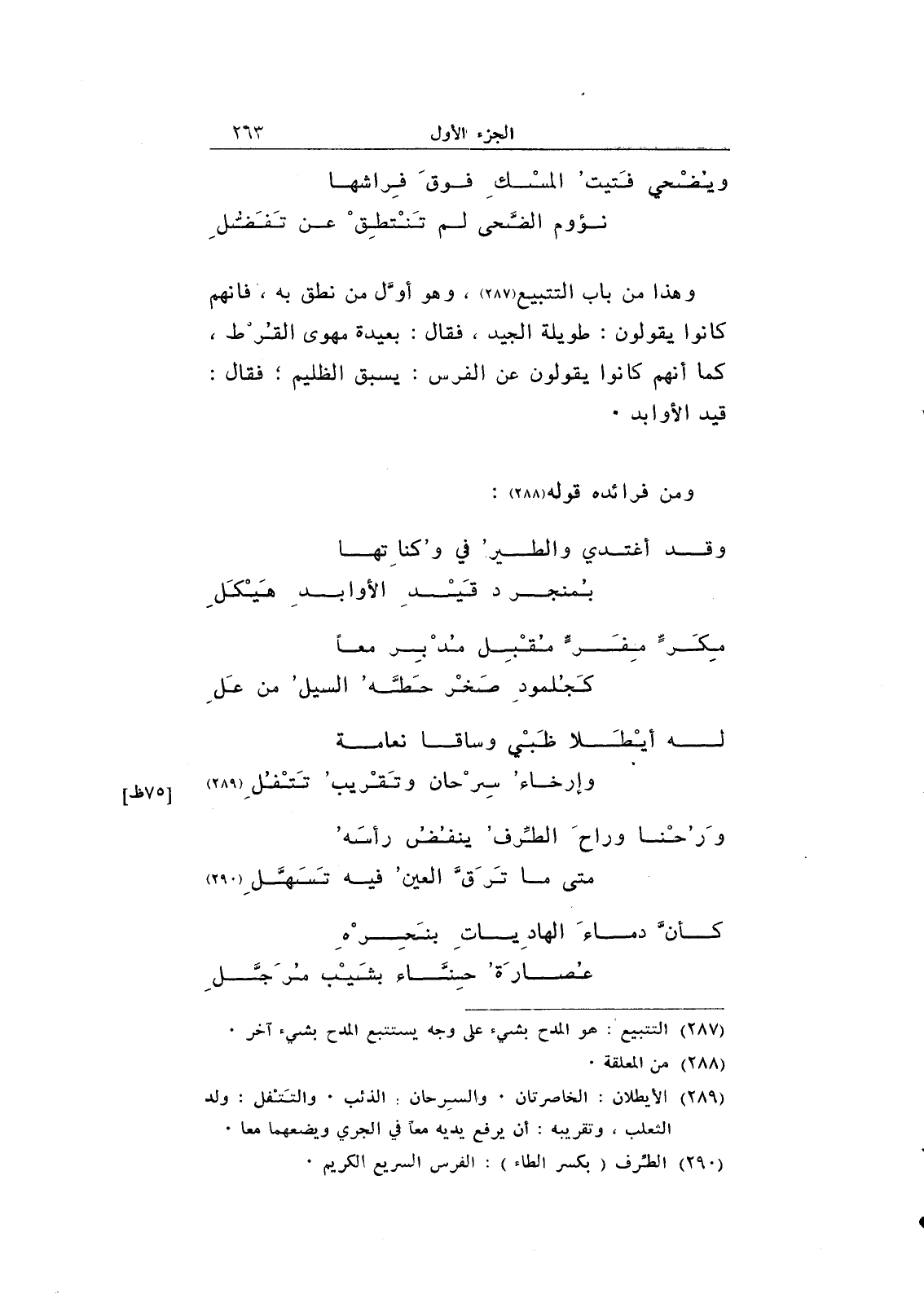 وهذا من باب التتبيع، وهو أول من نطق به، فإنهم كانوا يقولون: طويلة الجيد، فقال: بعيدة مهوى القرط، كما أنهم كانوا يقولون عن الفرس: يسبق الظليم؛ فقال: قيد الأوابد.