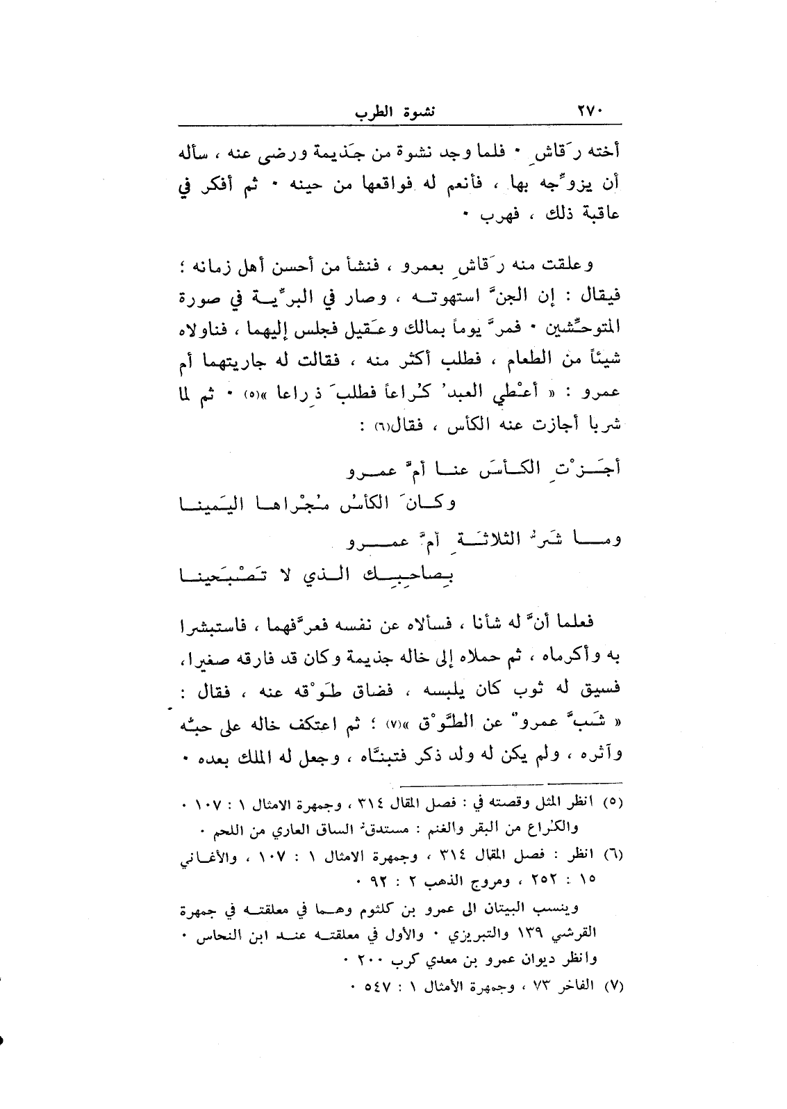 فعلما أن له شأناً، فسألاه عن نفسه فعرفهما، فاستبشرا به وأكرماه، ثم حملاه إلى خالة جذيمة وكان قد فارقه صغيراً، فسيق له ثوب كان يلبسه، فضاق طوقه عنه، فقال: "شب عمرو عن الطوق"؛ ثم اعتكف خاله على حبه وآثره، ولم يكن له ولد ذكر فتبناه، وجعل له الملك بعده.