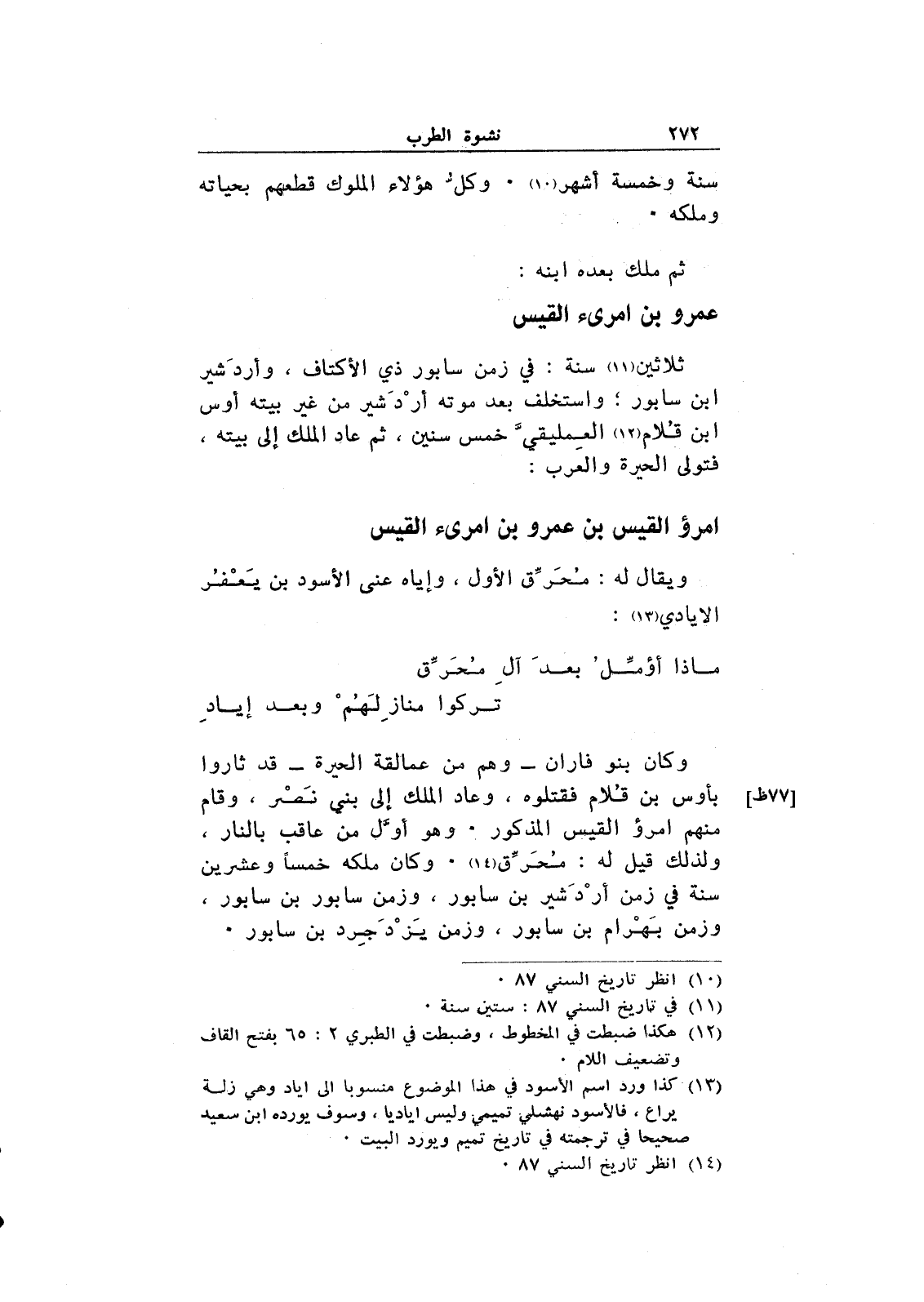 وكان بنو فاران - وهم من عمالقة الحيرة - قد ثاروا بأوس بن قلام فقتلوه، وعاد الملك إلى بني نصر، وقام منهم امرؤ القيس المذكور. وهو أول من عاقب بالنار، ولذلك قيل له: محرق. وكان ملكه خمساً وعشرين سنة في زمن أردشير بن سابور، وزمن سابور بن سابور، وزمن بهرام بن سابور، وزمن يزدجرد بن سابور.