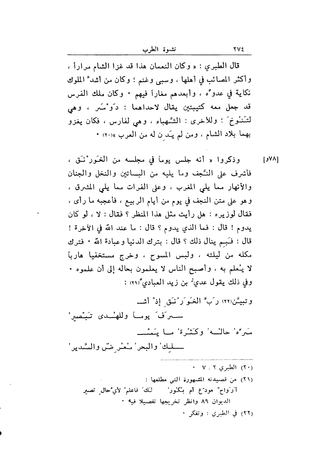 وذكروا "أنه جلس يوماً في مجلسه من الخورنق، فأشرف على النجف وما يليه من البساتين والنخل والجنان والأنهار مما يلي المغرب، وعلى الفرات مما يلي المشرق، وهو على متن النجف في يوم من أيام الربيع، فأعجبه ما رأى، فقال لوزيره: هل رأيت مثل هذا المنظر! فقال: لا، لو كان يدوم! قال: فما الذي يدوم؟ قال: ما عند الله في الآخرة! قال: فبم ينال ذلك؟ قال: بترك الدنيا وعبادة الله. فترك مكله من ليلته، ولبس المسوح، وخرج مستخفياً هارباً لا يعلم به، وأصبح الناس لا يعلمون بحاله إلى أن علموه. وفي ذلك يقول عدي بن زيد العبادي: