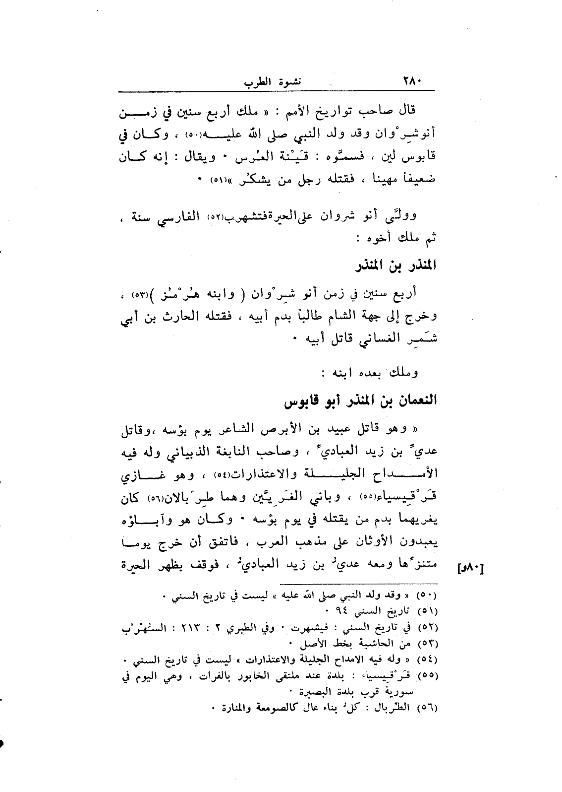 "وهو قاتل عبيد بن الأبرص الشاعر يوم بؤسه، وقاتل عدي بن زيد العبادي، وصاحب النابغة الذبياني وله فيه الأمداح الجليلة والاعتذارات، وهو غازي قرقيسياء، وباني الغريين وهما طربالان كان يغريهما بدم من يقتله في يوم بؤسه. وكان هو وآباؤه يعبدون الأوثان على مذهب العرب، فاتفق أن خرج يوماً متنزها ومعه عدي بن زيد العبادي، فوقف بظهر الحيرة
