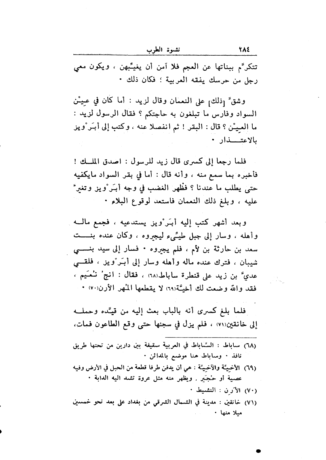 وشق [ذلك] على النعمان وقال لزيد: أما كان في عين السواد وفارس ما تبلغون به حاجتكم؟ فقال الرسول لزيد: ما العين؟ قال: البقر! ثم انفصلا عنه، وكتب إلى أبرويز بالاعتذار.