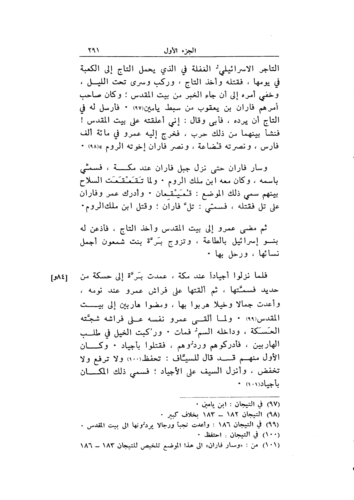 التاجر الإسرائيلي الغفلة في الذي يحمل التاج إلى الكعبة في يومها، فقتله وأخذ التاج، وركب وسرى تحت الليل، وخفي أمره إلى أن جاء الخبر من بيت المقدس؛ وكان صاحب أمرهم فاران بن يعقوب من سبط يامين. فأرسل له في التاج أن يرده، فأبى وقال: إني أعلقته على بيت المقدس! فنشأ بينهما في ذلك حرب، فخرج إليه عمرو في مائة ألف فارس، ونصرته قضاعة، ونصر فاران إخوته الروم".
