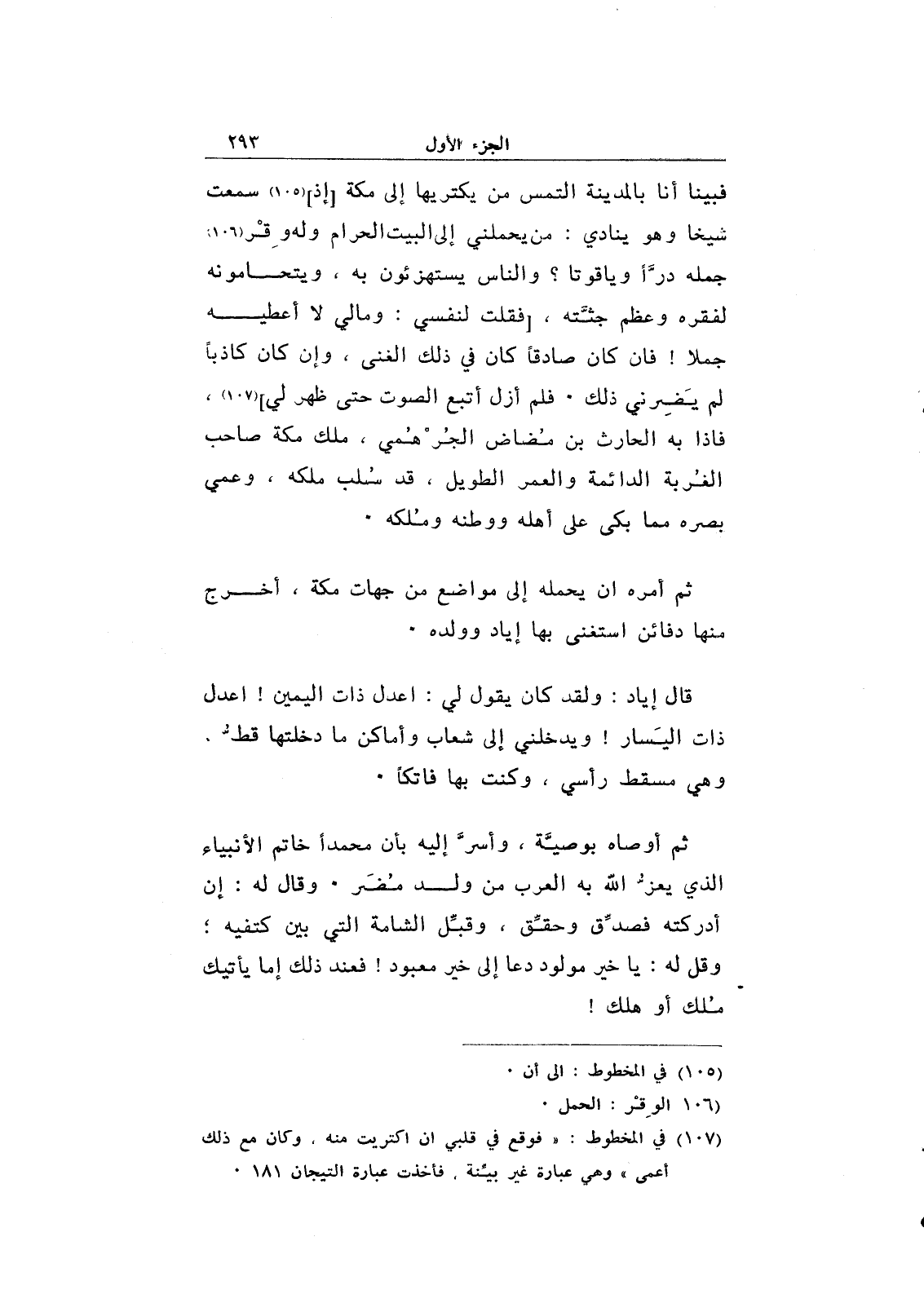 ثم أوصاه بوصية، وأسر إليه بأن محمداً خاتم الأنبياء الذي يعز الله به العرب من ولد مضر. وقال له: إن أدركته فصدق وحقق، وقبل الشامة التي بين كتفيه؛ وقل له: يا خير مولود دعا إلى خير معبود! فعند ذلك إما تأتيك ملك أو هلك!