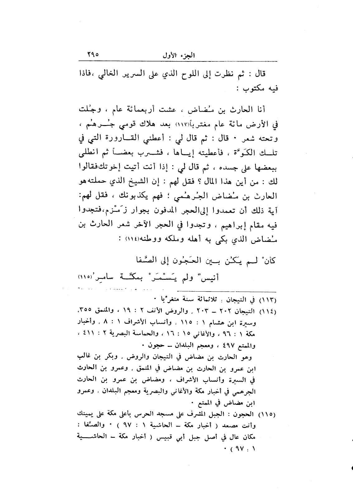 قال: ثم نظرت إلى اللوح الذي على السرير الخالي، فإذا فيه مكتوب: أنا الحارث بن مضاض، عشت أربعمائة عام، وجلت في الأرض مائة عام مغترباً بعد هلاك قومي جرهم، وتحته شعر. قال: ثم قال لي: أعطني القارورة التي في تلك الكوة، فأعطيته إياها، فشرب بعضاً ثم انطلى ببعضها على جسده، ثم قال لي: إذا أنت أتيت إخوتك فقالوا لك: من أين هذا المال؟ فقل لهم: إن الشيخ الذي حملته هو الحارث بن مضاض الجرهمي؛ فهم يكذبونك، فقل لهم: آية ذلك أن تعمدوا إلى الحجر المدفون بجوار زمزم، فتجدوا فيه مقام إبراهيم، وتجدوا في الحجر الآخر شعر الحارث بن مضاض الذي بكى به أهله وملكه ووطنه: