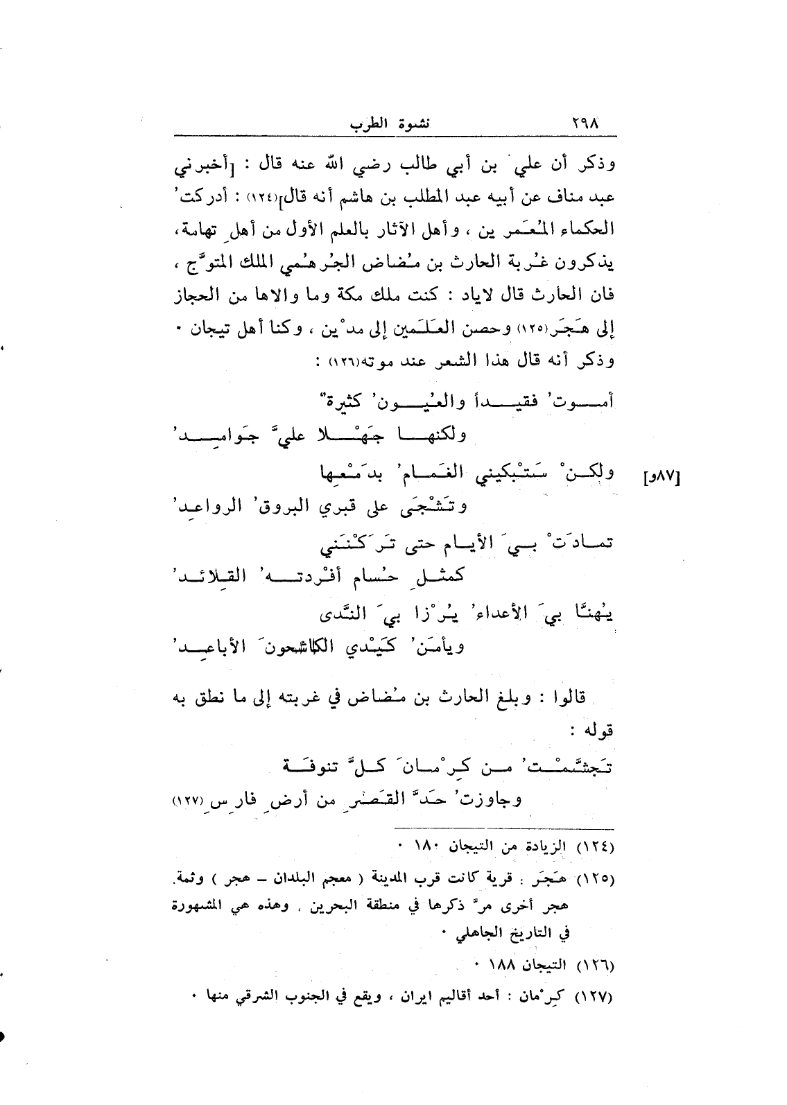 وذكر أن علي بن أبي طالب رضي الله عنه قال: [أخبرني عبد مناف عن أبيه عبد المطلب بن هاشم أنه قال] : أدركت الحكماء المعمرين، وأهل الآثار بالعلم الأول من أهل تهامة، يذكرون غربة الحارث بن مضاض الجرهمي الملك المتوج، فإن الحارث قال لإياد: كنت ملك مكة وما والاها من الحجاز إلى هجر وحصن العلمين إلى مدين، وكنا أهل تيجان. وذكر أنه قال هذا الشعر عند موته: