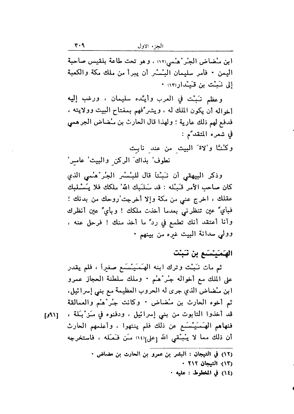 ثم مات نبت وترك ابنه الهميسع صغيراً، فلم يقدر على الملك مع أخواله جرهم. وملك سلطنة الحجاز عمرو بن مضاض الذي جرى له الحروب العظيمة مع بني إسرائيل، ثم أخوه الحارث بن مضاض. وكانت جرهم والعمالقة قد أخذوا التابوت من بني إسرائيل، ودفنوه في مزبلة، فنهاهم الهميسع عن ذلك فلم ينتهوا، وأعلمهم الحارث أن ذلك مما لا يبقي الله [على] من فعله، فاستخرجه