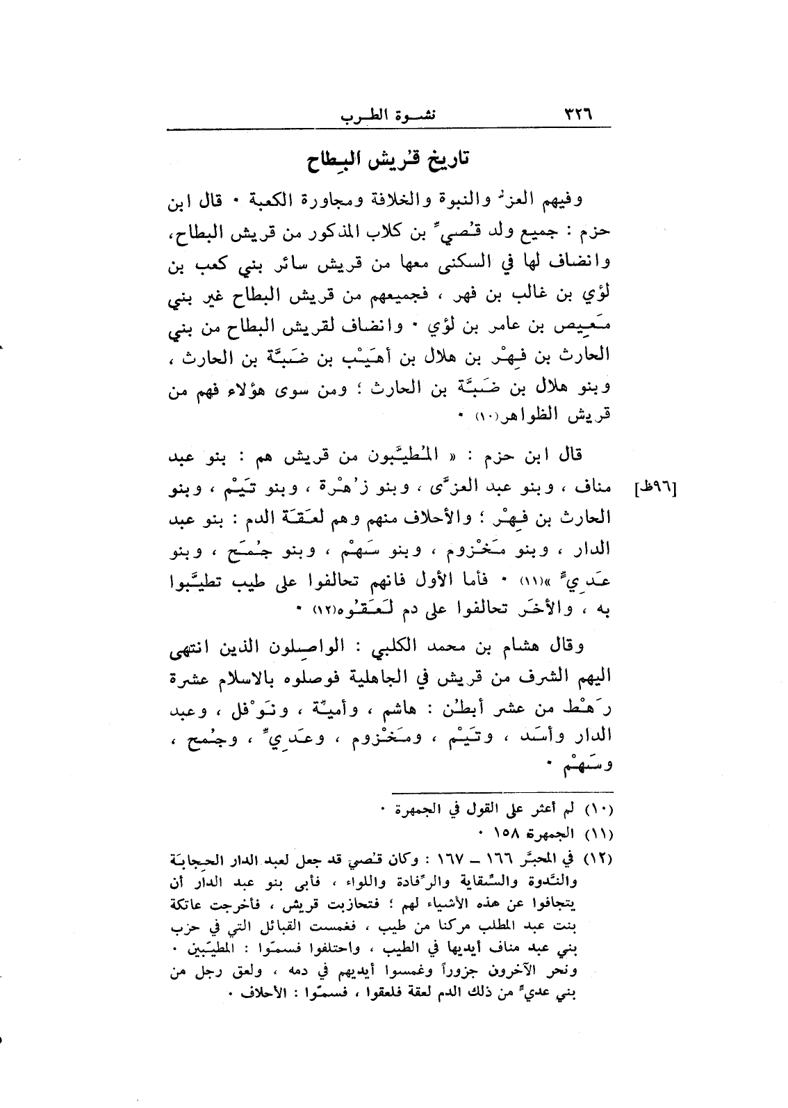 وفيهم العز والنبوة والخلافة ومجاورة الكعبة. قال ابن حزم: جميع ولد قصي بن كلاب المذكور من قريش البطاح، وانضاف لها في السكنى معها من قريش سائر بني كعب بن لؤي بن عامر بن لؤي. وانضاف لقريش البطاح من بني الحارث بن فهر بن هلال بن أهيب بن ضبة بن الحارث، وبنو هلال بن ضبة بن الحارث؛ ومن سوى هؤلاء فهم من قريش الظواهر.