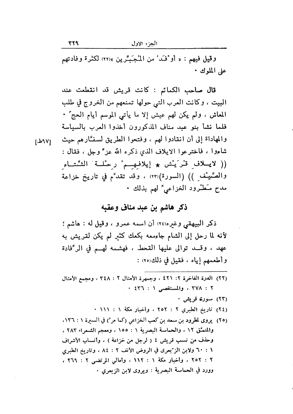 قال صاحب الكمائم: كانت قريش قد انقطعت عند البيت، وكانت العرب التي حولها تمنعهم من الخروج في طلب المعاش، ولم يكن لهم عيش إلا ما يأتي الموسم أيام الحج. فلما نشأ بنو عبد مناف المذكورون أخذوا العرب بالسياسة والمهاداة إلى أن انقادوا لهم، وفتحوا الطريق لسفارهم حيث شاءوا، فاخترعوا الإيلاف الذي ذكره الله عز وجل، فقال: "لإيلاف قريش إيلافهم رحلة الشتاء والصيف" (السورة) ، وقد تقدم في تاريخ خزاعة مدح مطرود الخزاعي لهم بذلك.