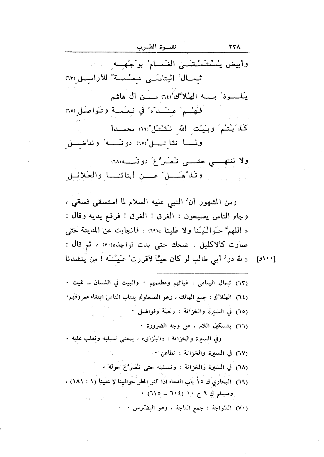 ومن المشهور أن النبي عليه السلام لما استسقى فسقي، وجاء الناس يصيحون: الغرق! الغرق! فرفع يديه وقال: "اللهم حوالينا ولا علينا"، فانجابت عن المدينة حتى صارت كالإكليل، ضحك حتى بدت نواجذه، ثم قال: "لله در أبي طالب لو كان حياً لأقررت عينه! من ينشدها