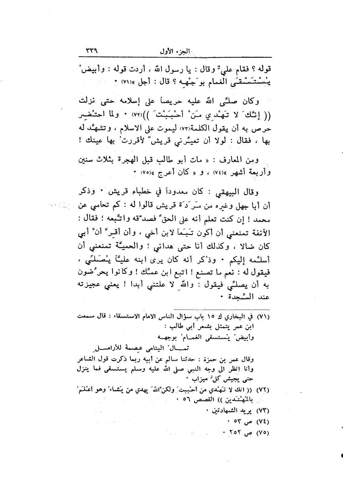 وقال البيهقي: كان معدوداً في خطباء قريش. وذكر أن أبا جهل وغيره من مردة قريش قالوا له: كم تحامي عن محمد! إن كنت تعلم أن على الحق فصدقه واتبعه؛ فقال: الأنفة تمنعني أن أكون تبعاً لابن أخي، وأن أقر أن أبي كان ضالا، وكذلك أنا حتى هداني؛ والحمية تمنعني أن أسلمه إليكم. وذكر أنه كان يرى ابنه علياً يصلي، فيقول له: نعم ما تصنع! اتبع ابن عمك! وكانوا يحرضون به أن يصلي فيقول: والله لا علتني أبداً! يعني عجيزته عند السجدة.