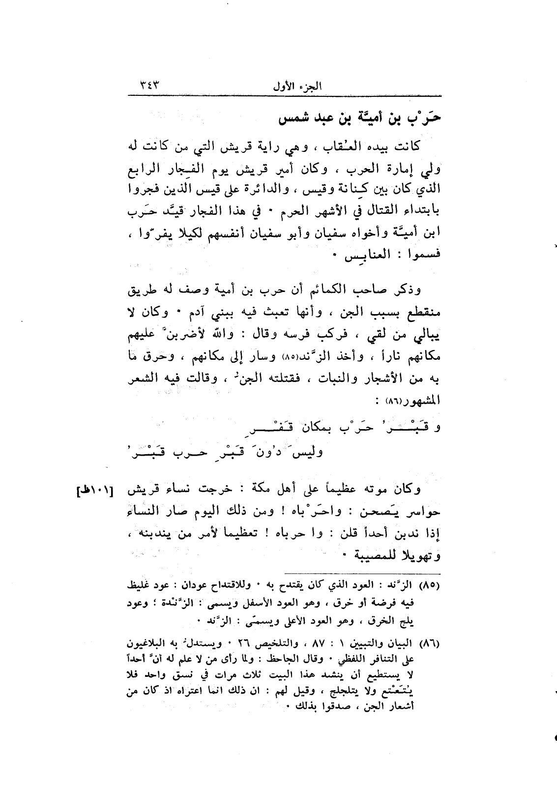 وذكر صاحب الكمائم أن حرب بن أمية وصف له طريق منقطع بسبب الجن، وأنها تعبث فيه ببني آدم. وكان لا يبالي من لقي، فركب فرسه وقال: والله لأضربن عليهم مكانهم ناراً، وأخذ الزند وسار إلى مكانهم، وحرق ما به من الأشجار والنبات، فقتلته الجن، وقالت فيه الشعر المشهور: