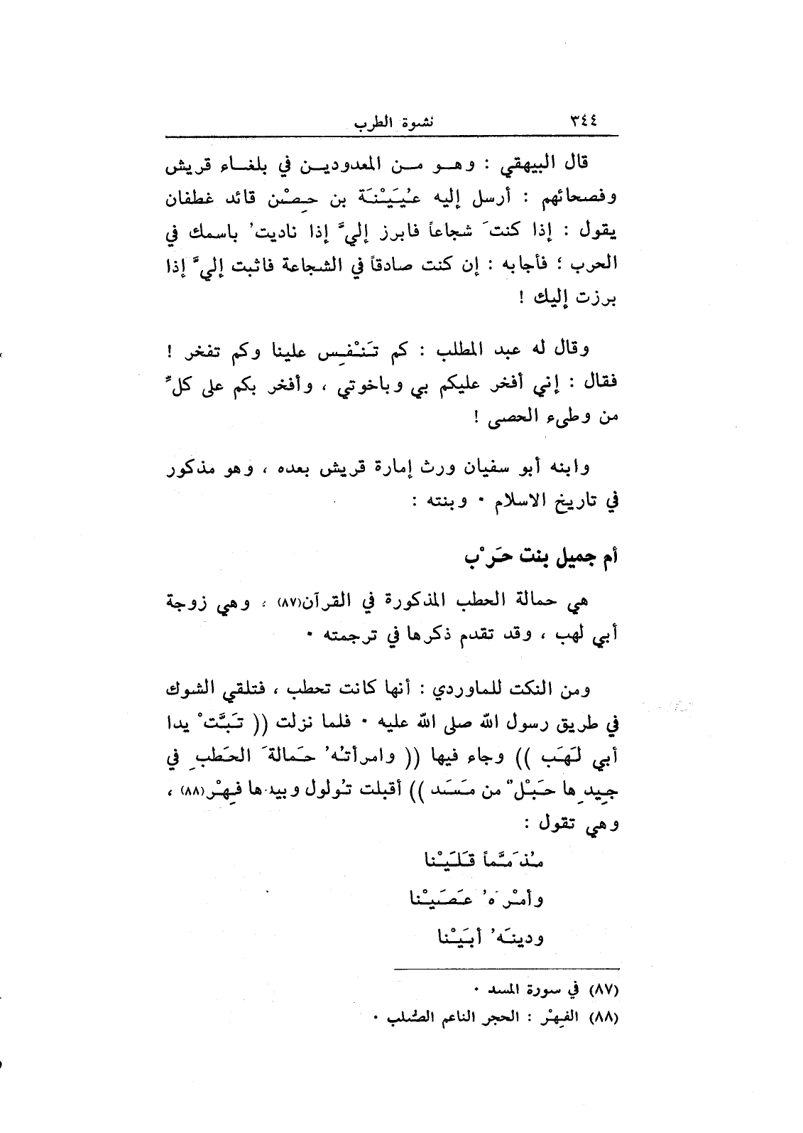 ومن النكت للماوردي: أنها كانت تحطب، فتلقي الشوك في طريق رسول الله صلى الله عليه. فلما نزلت "تبت يدا أبي لهب" وجاء فيها "وامرأته حمالة الحطب في جيدها حبل من مسد" أقبلت تولول وبيدها فهر، وهي تقول: مذمماً قلينا وأمره عصينا ودينه أبينا