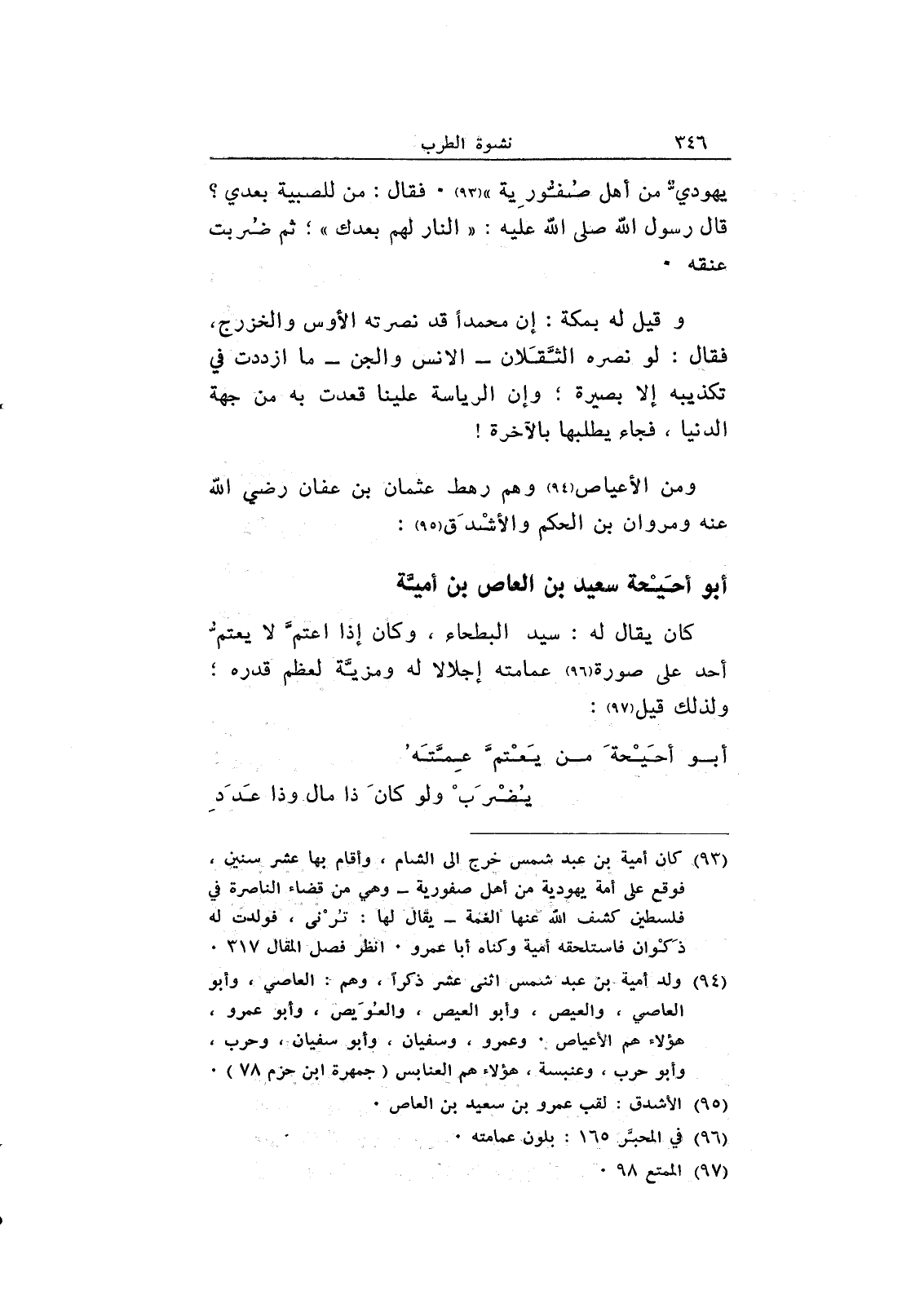 وقيل له بمكة: إن محمداً قد نصرته الأوس والخزرج، فقال: لو نصره الثقلان - الإنس والجن - ما ازددت في تكذيبه إلا بصيرة؛ وإن الرياسة علينا قعدت به من جهة الدنيا، فجاء يطلبها بالآخرة! ومن الأعياص وهم رهط عثمان بن عفان رضي الله عنه ومروان بن الحكم والأشدق: