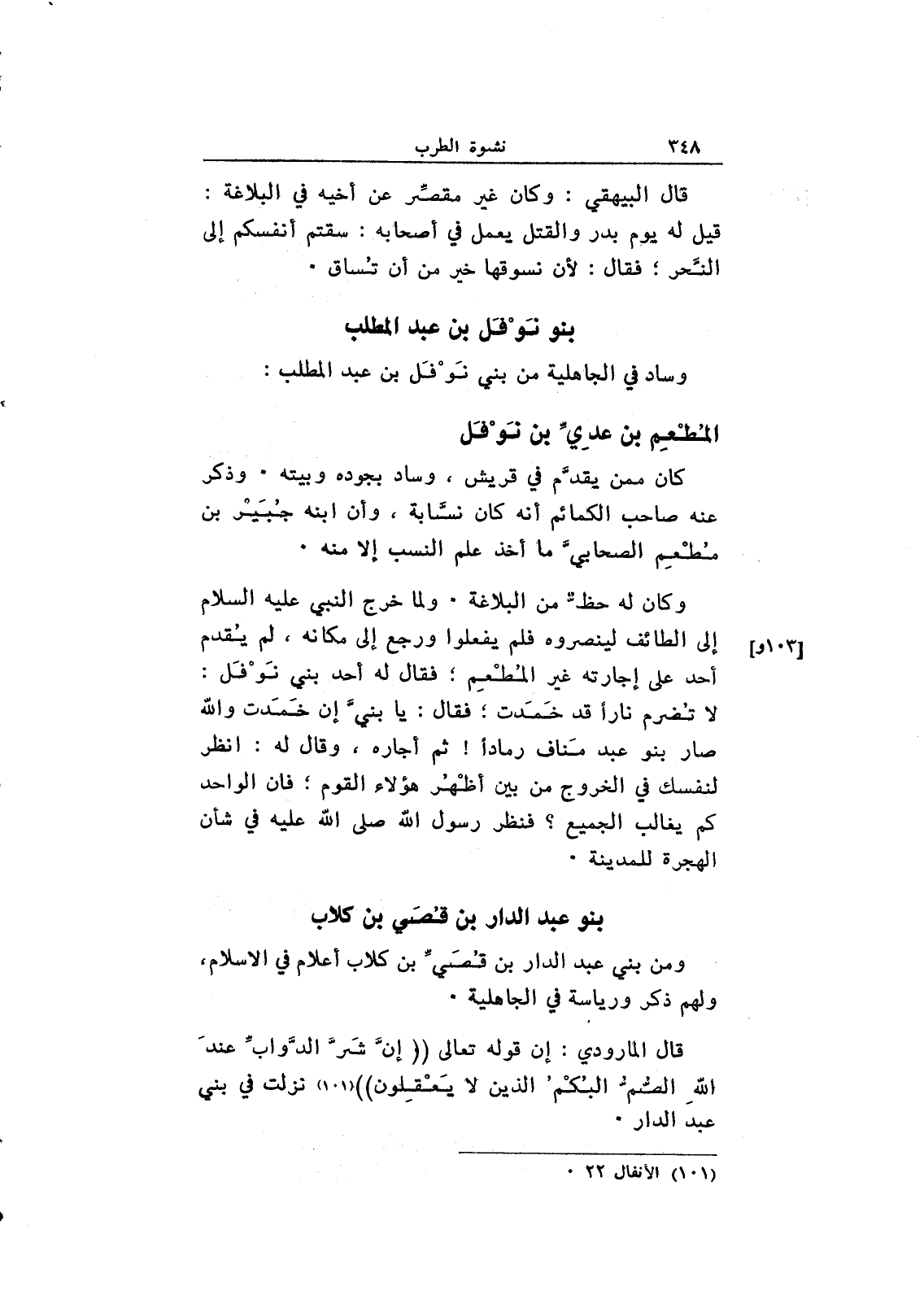 وكان له حظ من البلاغة. ولما خرج النبي عليه السلام إلى الطائف لينصروه فلم يفعلوا ورجع إلى مكانه، لم يقدم أحد على إجارته غير المطعم؛ فقال له أحد بني نوفل: لا تضرم ناراً قد خمدت؛ فقال: يا بني إن خمدت والله صار بنو عبد مناف رماداً! ثم أجاره، وقال له: انظر لنفسك في الخروج من بين أظهر هؤلاء القوم؛ فإن الواحد كم يغالب الجميع؟ فنظر رسول الله صلى الله عليه في شأن الهجرة للمدينة.