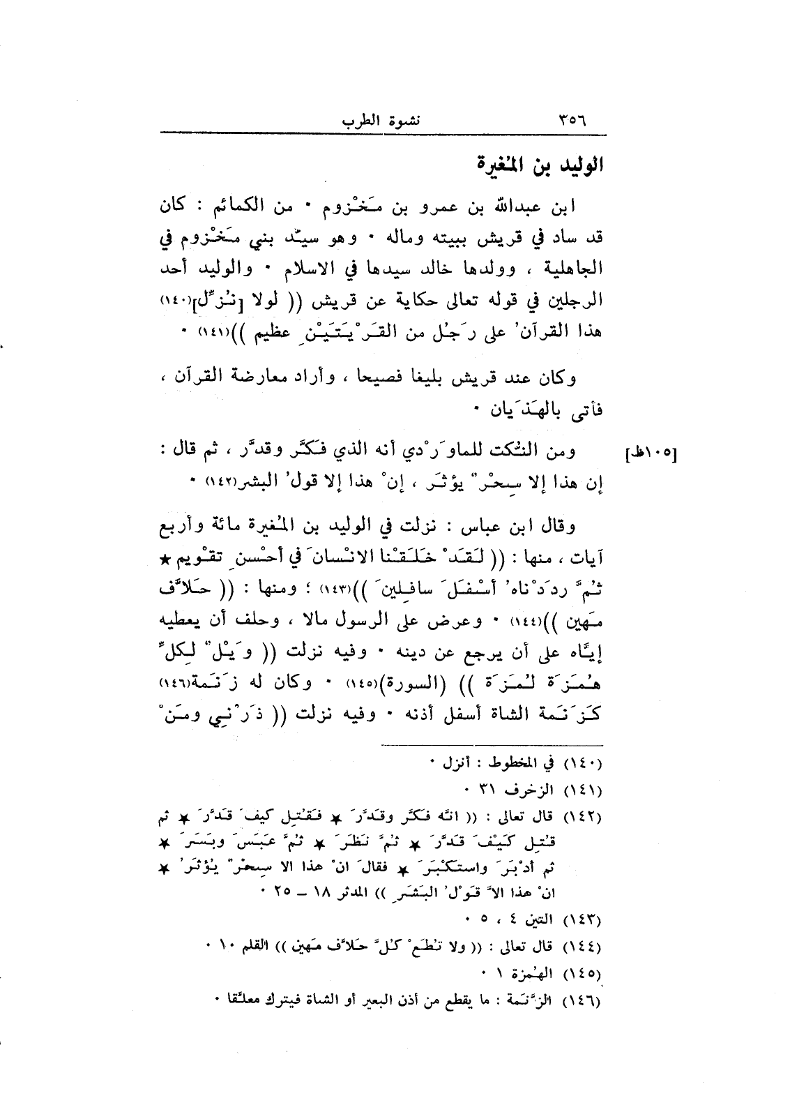 وقال ابن عباس: نزلت في الوليد بن المغيرة مائة وأربع آيات، منها: "لقد خلقنا الإنسان في أحسن تقويم ثم رددناه أسفل سافلين"؛ ومنها: (حلاف مهين". وعرض على الرسول مالا، وحلف أن يعطيه إياه على أن يرجع عن دينه. وفيه نزلت "ويل لكل همزة لمزة" (السورة) . وكان له زنمة كزنمة الشاة أسفل أذنه. وفيه نزلت "ذرني ومن