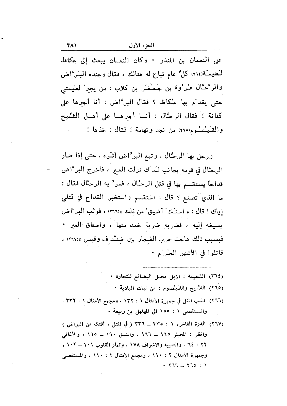 على النعمان بن المنذر. وكان النعمان يبعث إلى عكاظ لطيمة كل عام تباع له هنالك، فقال وعنده البراض والرحال عروة بن جعفر بن كلاب: من يجير لطيمتي حتى يقدم بها عكاظ؟ فقال البراض: أنا أجيرها على كنانة؛ فقال الرحال: أنا أجيرها على أهل الشيح والقيصوم من نجد وتهامة؛ فقال: خذها!
