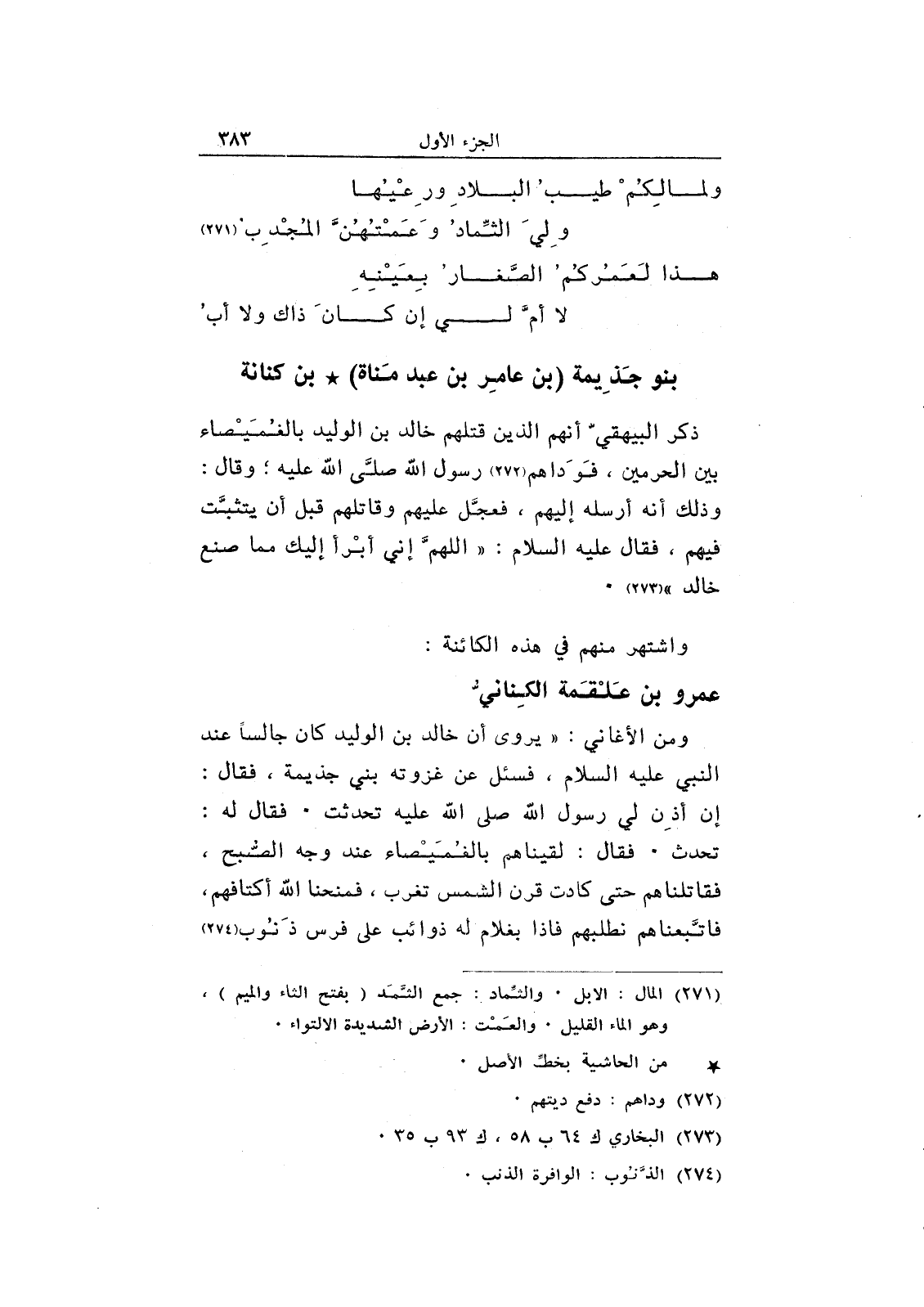 ومن الأغاني: "يروى أن خالد بن الوليد كان جالساً عند النبي عليه السلام، فسئل عن غزوته بني جذيمة، فقال: إن أذن لي رسول الله صلى الله عليه تحدثت. فقال له: تحدث. فقال: لقيناهم بالغميصاء عند وجه الصبح، فقاتلناهم حتى كادت قرن الشمس تغرب، فمنحنا الله أكتافهم، فاتبعناهم نطلبهم فإذا بغلام له ذوائب على فرس ذنوب