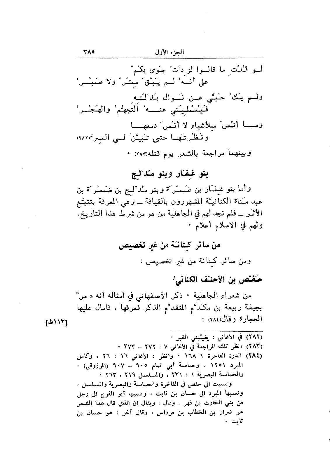 وأما بنو غفار بن ضمرة وبنو مدلج بن ضمرة بن عبد مناة الكنانية المشهورون بالقيافة _ وهي المعرفة بتتبع الأثر _ فلم نجد لهم في الجاهلية من هو من شرط هذا التاريخ، ولهم في الإسلام أعلام.