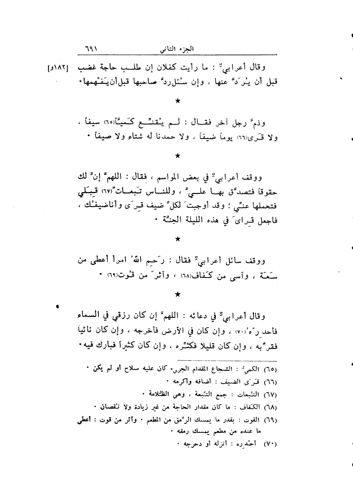 ووقف أعرابي في بعض المواسم، فقال: اللهم إن لك حقوقاً فتصدق بها علي، وللناس تبعات قبلي فتحملها عني؛ وقد أوجبت لكل ضيف قرى وأنا ضيفك، فاجعل قراي في هذه الليلة الجنة.