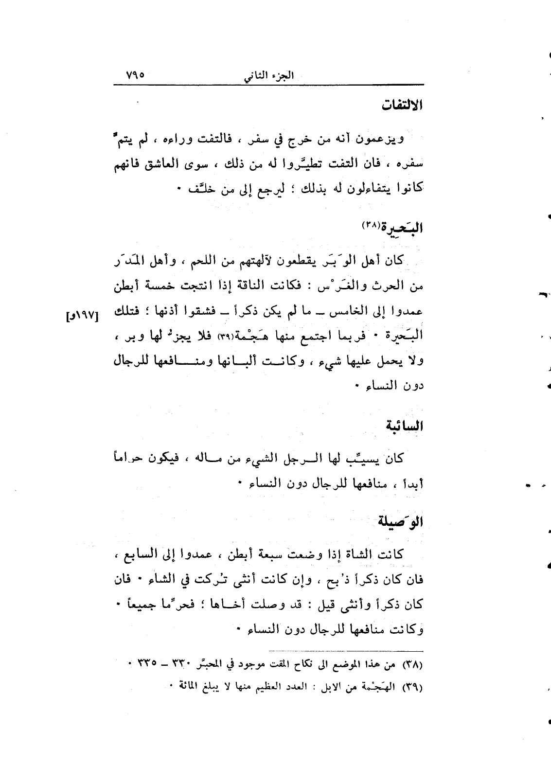 كانت الشاة إذا وضعت سبعة أبطن، عمدوا إلى السابع، فإن كان ذكراً ذبح، وإن كانت أنثى تركت في الشاء. فإن كان ذكراً وأنثى قيل: قد وصلت أخاها؛ فحرما جميعاً. وكانت منافعها للرجال دون النساء.